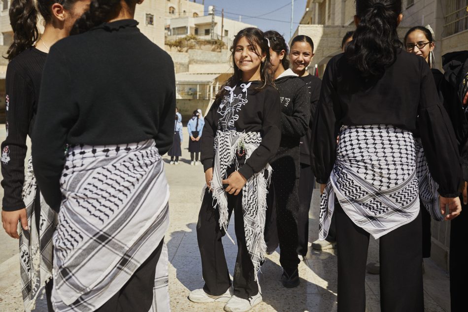 Palæstinensiske skolebørn med nationaltørklæderne bundet om livet.