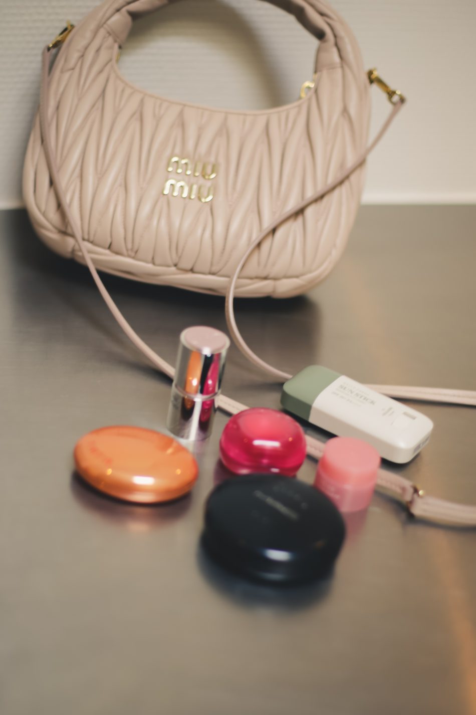 Jeg er jo ret heldig altid at have det meste lige ved hånden på arbejdet, men på mit skrivebord er der altid en god fugtgivende mist fra Village 11, ‘FreshDewyCica Mist’, ‘LipSleepingMask’-læbepomade fra Laneige og ‘Skin Barrier Professional Hand Lotion’ fra Pyunkang Yul.