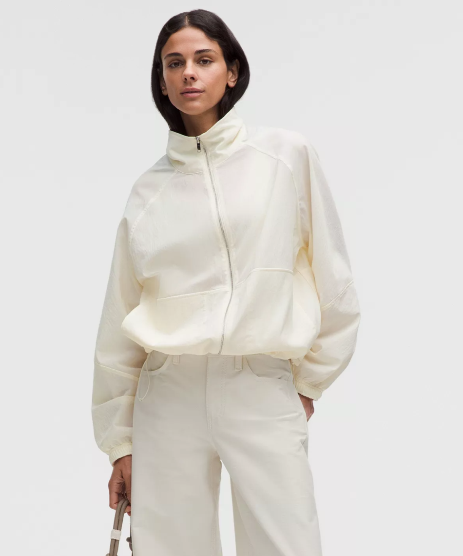 Denne lette jakke er det perfekte ekstra lag, når temperaturen skifter i løbet af dagen. Den rene silhuet og lyse nuance gør den nem at kaste over dit træningslook.