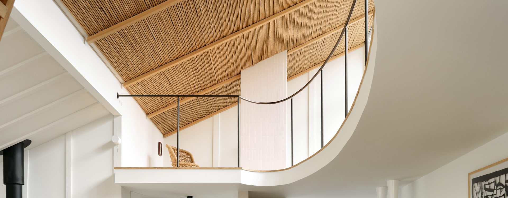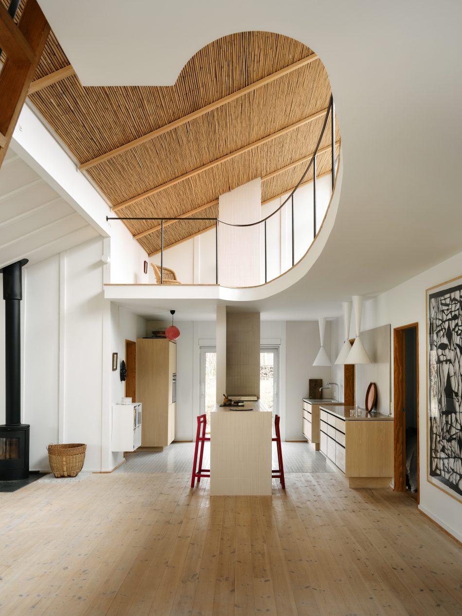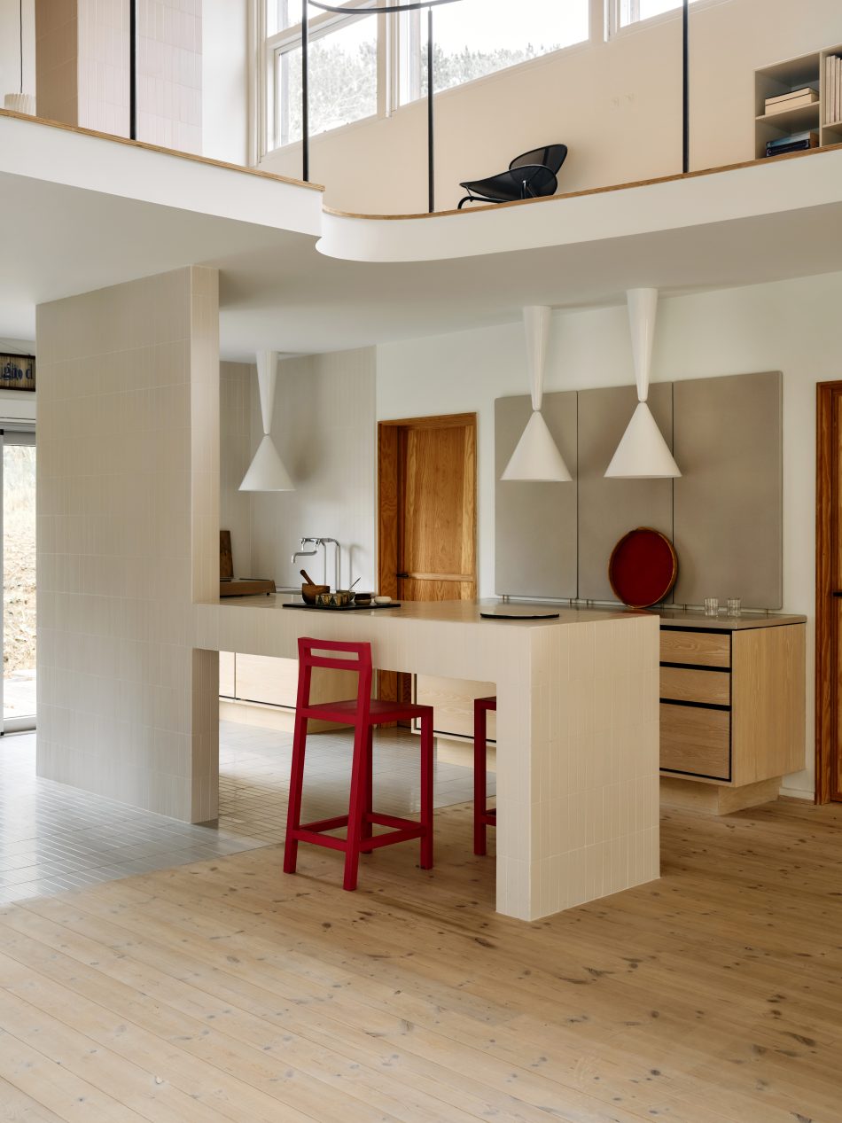 Den buede konstruktion på mezzaninen skaber et skulpturelt udtryk, der er present uanset, hvor i det store rum, man opholder sig. Loftet, der er beklædt med bambus, tilfører et taktilt udtryk og en helt særlig varm stemning i huset. Selve køkkenet er skabt af Garde Hvalsøe med File Under Pop-lerfliser med glasur i farven 'Under My Skin’. Backsplashen af lavasten er skabt særligt til køkkenet og er glaseret i farven ‘Life Is A Rose’. Det store værk på væggen er af Mathias Malling Mortensen, mens lamperne over køkkenbordet er fra Flos, og er designet af Achille Castiglioni. Den pink glaslampe er af Helle Mardahl, mens de pink høje stole er fra Archival Studies.