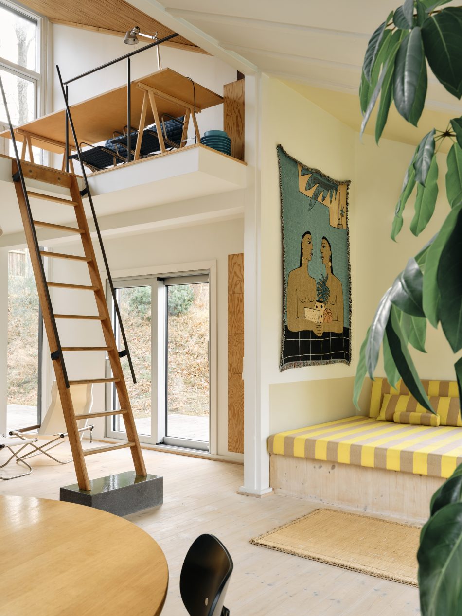 Særligt tilfredse er Josephine og Peter med mezzaninen, der indbyder til stille stunder med udsigt til himlen og trætoppene, og badeværelset med de prikkede fliser, som er designet af Elisa OssinoStudio for File Under Pop. Det er i det hele taget ikke svært at få øje på både Josephine og Peters aftryk i det særegne hus.