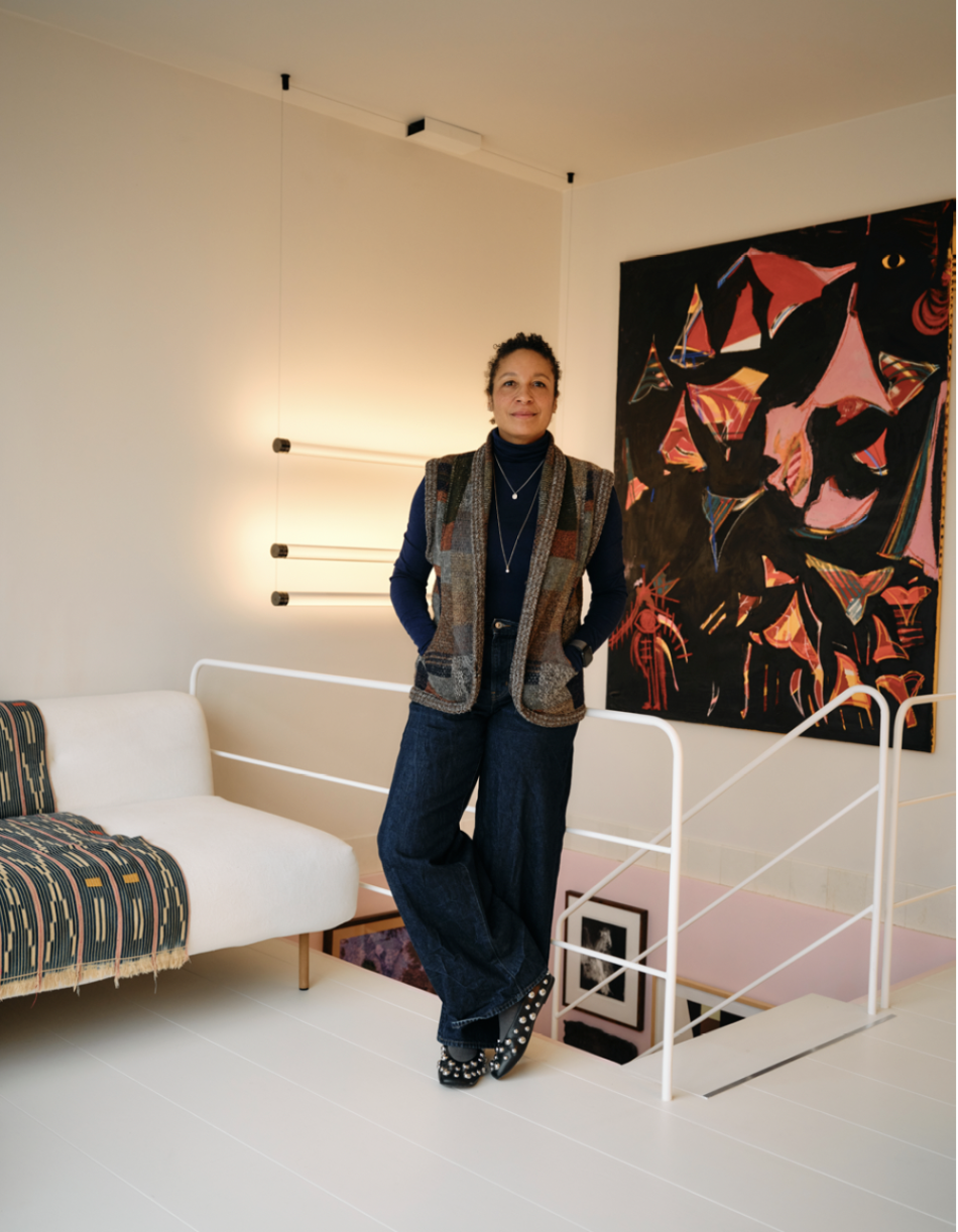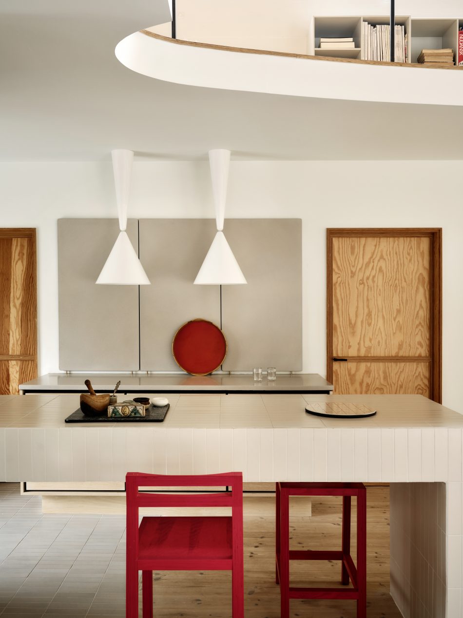De smukke døre i det ærlige materiale krydsfiner er skabt af Archival Studies, der også står bag de pink stole ved køkkenøen i midten. På mezzaninen ses en vintage-maske fra Tanzania og en sort stol fra Gubi.