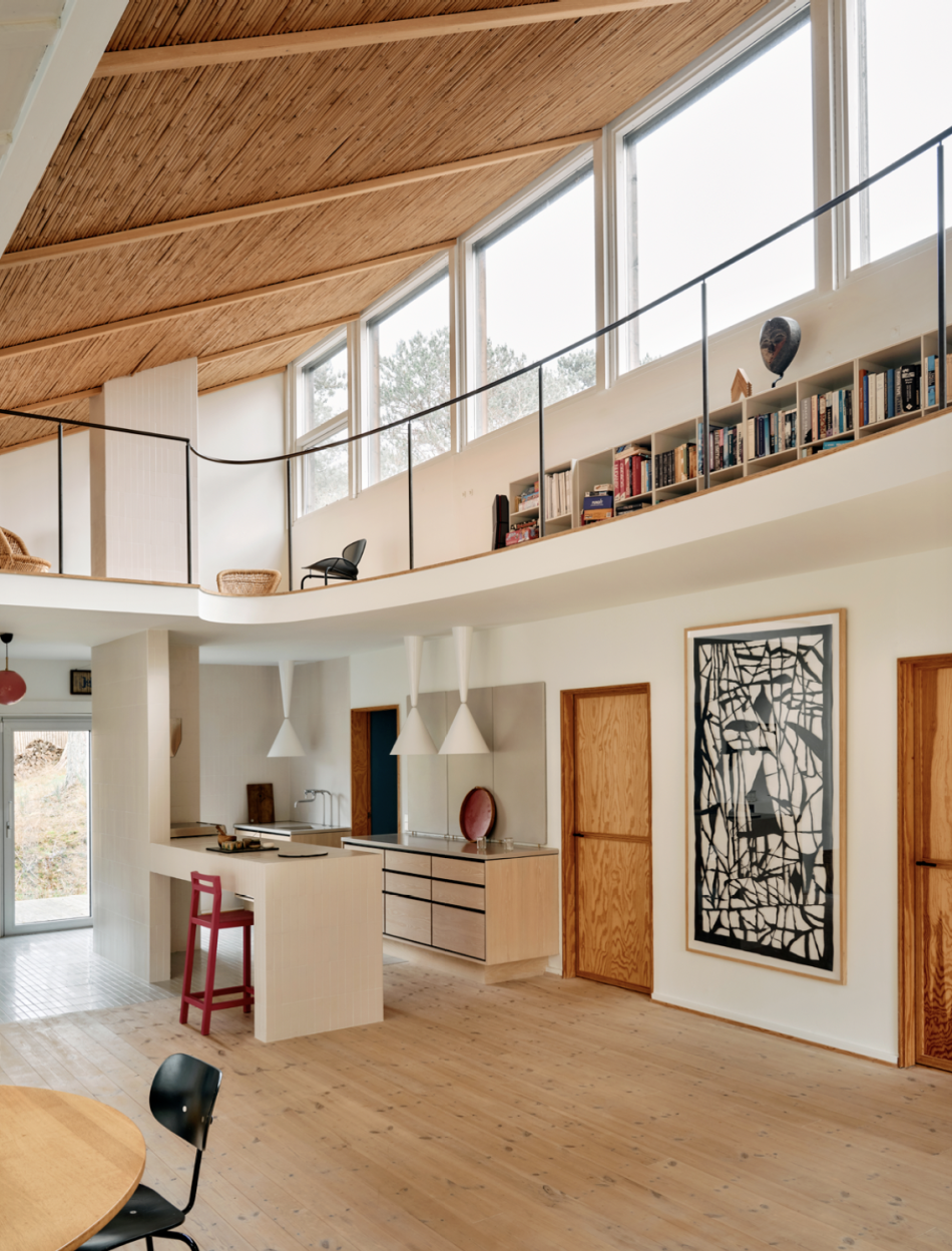 “Vi ville ikke bygge nyt til, men bygge videre på det gode grundmateriale, huset allerede bestod af. Vi ønskede at udnytte husets højde og etablere en mezzanin, der svæver under loftet – med biblioteksgang, kontorplads og en sekundær stue med plads til ro og fordybelse,” siger Josephine.