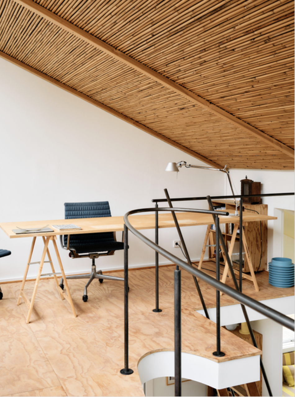 Det hyggelige arbejdshjørne på mezzaninen, hvorfra man både har privatliv og udsigt over hele rummet nedenfor, er indrettet med et bord sammensat af en plade af krydsfiner og bukke fra Silvan.