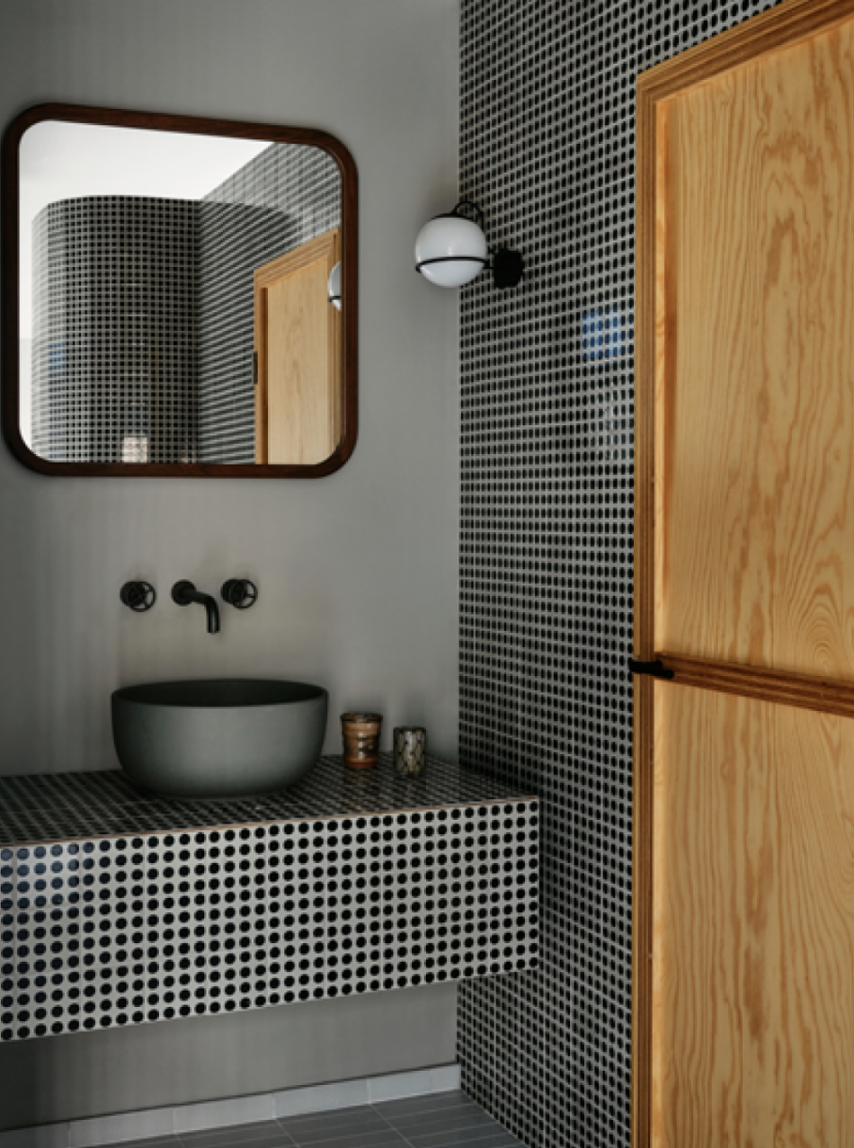 Badeværelset, der ligger overraskende i åben forlængelse af entreen, er indrettet med prikkede fliser designet af Elisa Ossino Studio for File Under Pop. Elisa Ossino Studio har også designet armaturet, Fantini. Spejlet er designet af OeO Studio for Fredericia Furniture, mens lamperne er fra Astep.