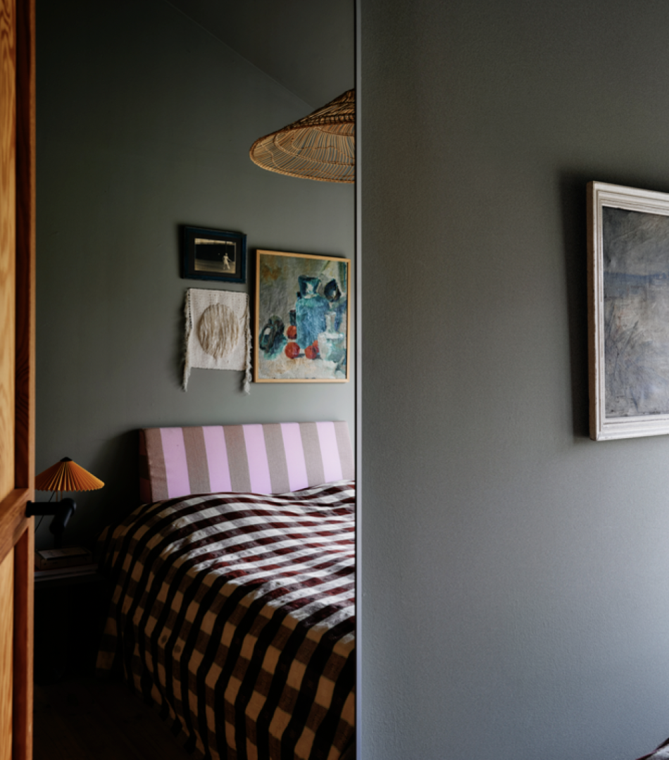 Farveholdningen i værelserne er i modsætning til det store rum holdt i mørkere nuancer, der skaber en hyggelig, lidt huleagtig stemning. Stolene langs væggen er af Egon Eiermann fra Please Wait to be Seated, mens stolen ved skrivebordet er designet af Mart Stam. Bordet er fra MA/U Studio De Padova, og standerlampen er fra Le Klint. På gulvet står en stor vintagekrukke fra Sicilien, mens værkerne på væggen er henholdsvis vintage fra Indien og et håndmalet wallpiece fra File Under Pop.