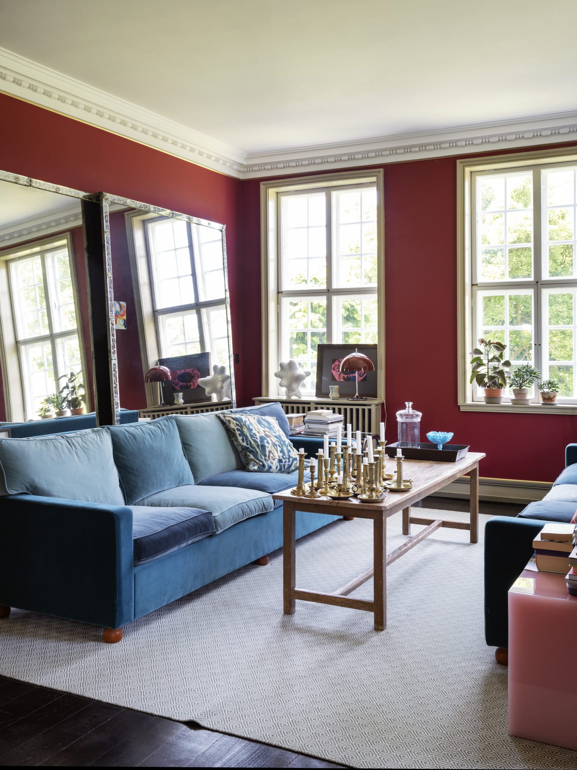 To store sofaer, model 3031, i velour i grøn-blå nuancer fra Svenskt Tenn, spiller smukt op imod rummets røde rammer. Tæppet fra Kasthall er vævet på mål, mens stuens øvrige interiør er vintage. To store unikke spejle gengiver lyset fra vinduerne og gør, at stuen føles større, end den er.