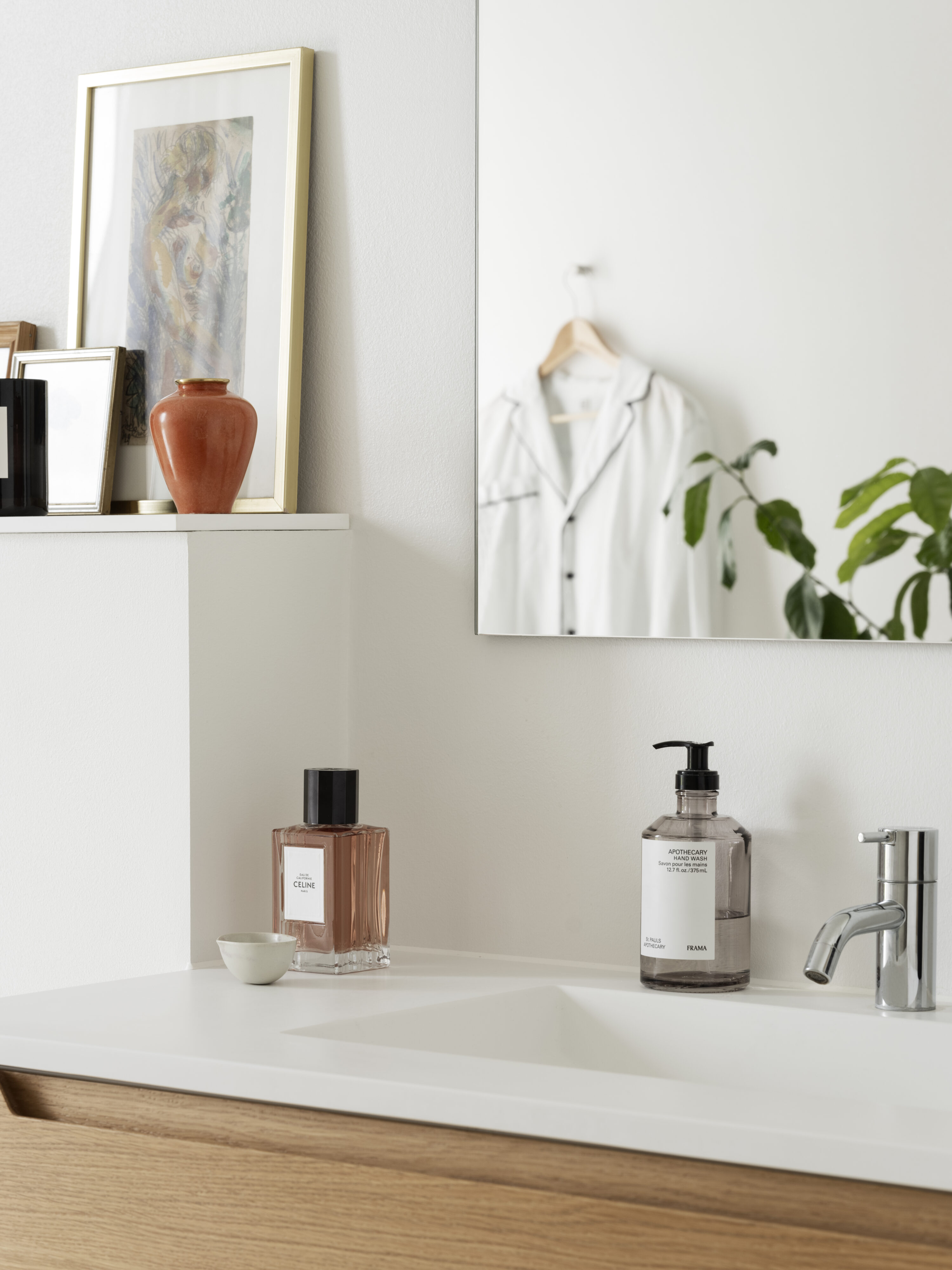 På husets andet badeværelse står en fin orange vase, som er et arvestykke sammen med en duft fra Celine og en håndsæbe fra Frama. Den lille skål er et arvestykke og skjorten i spejlbilledet er fra Toteme.