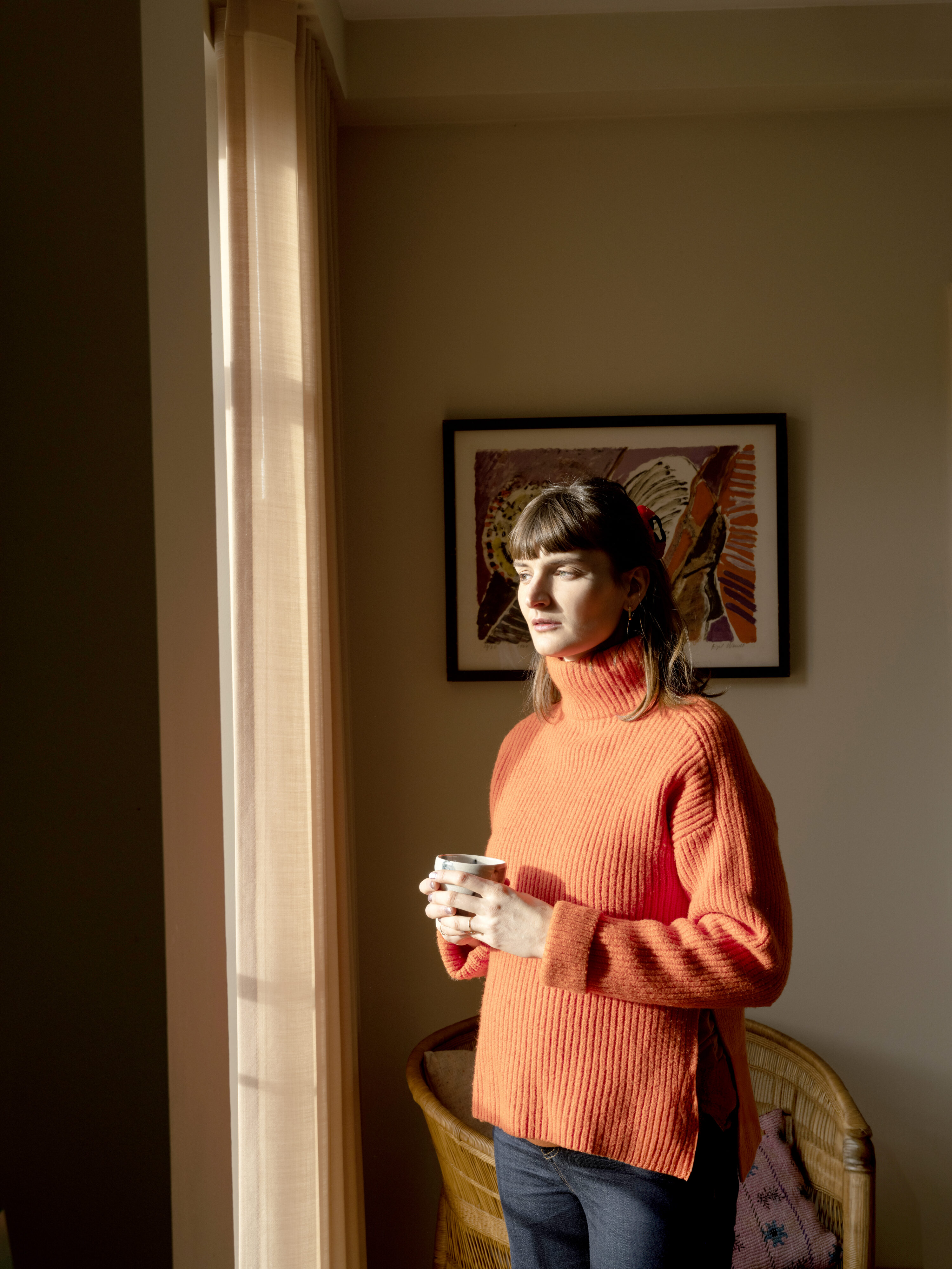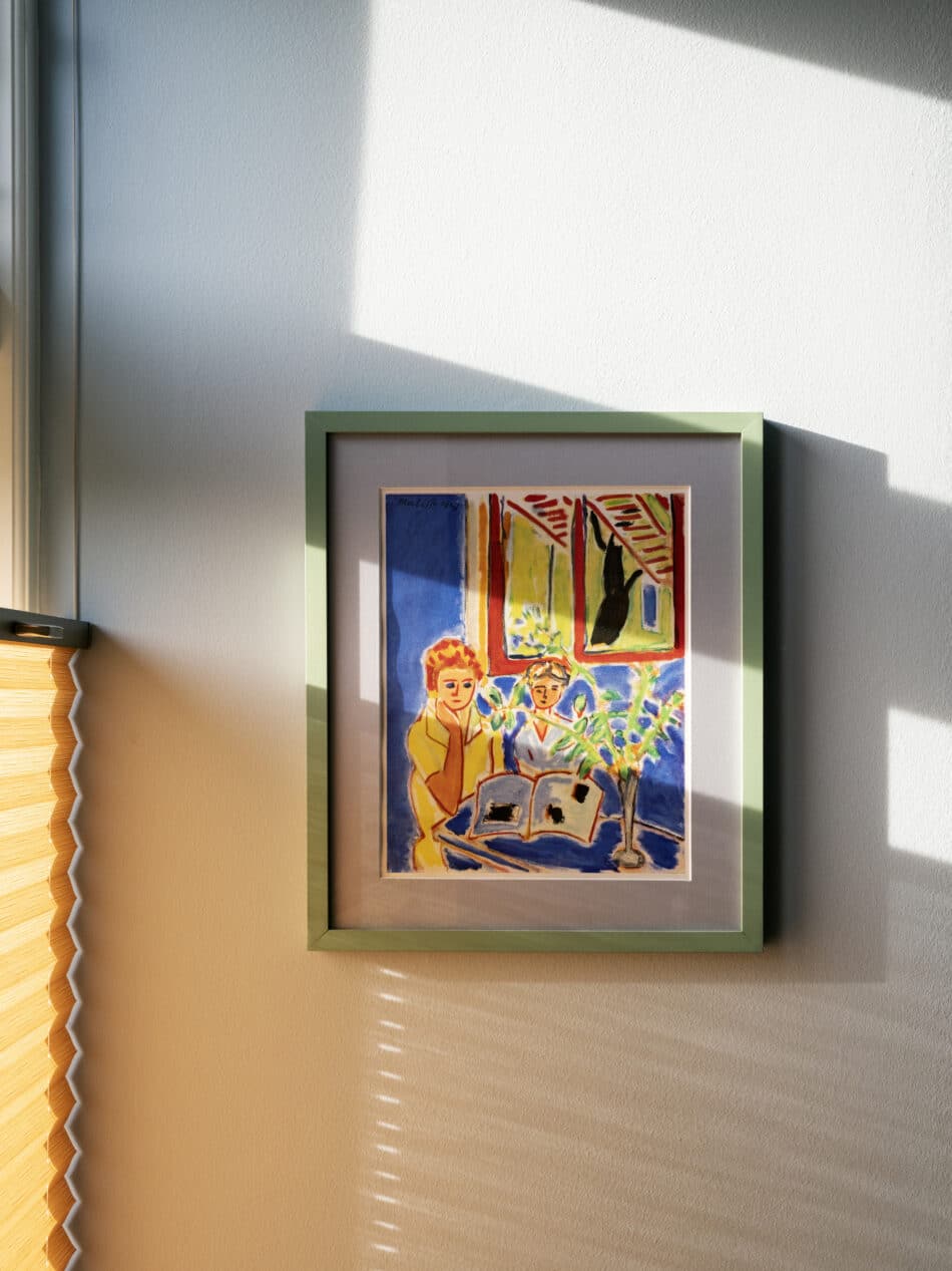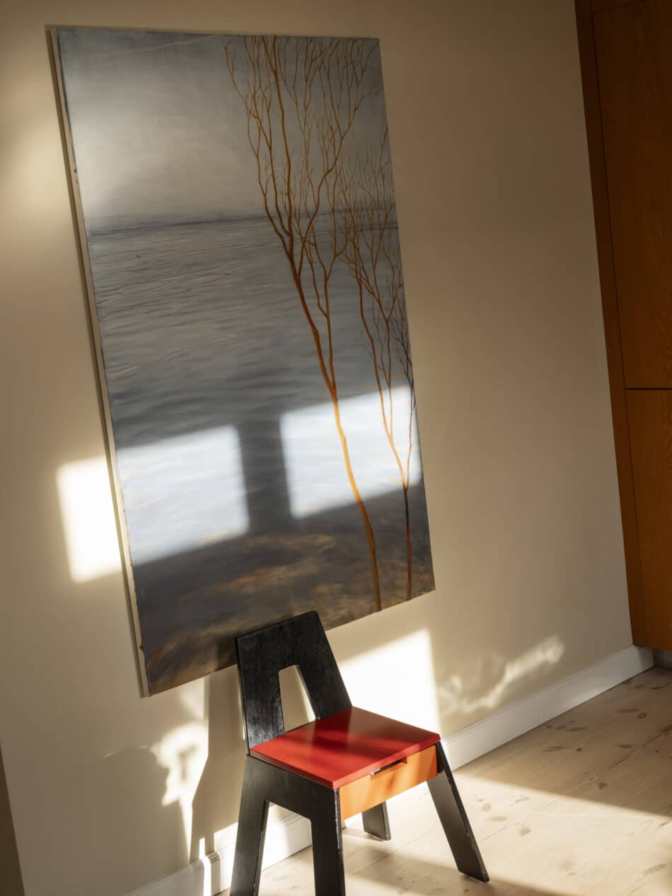 Solen bevæger sig gennem køkkenet dagen igennem og indrammer smukt depoetiske værk af Finn Richardt, der sammen med den røde vintagestol udgør et særegent lille tableau.
