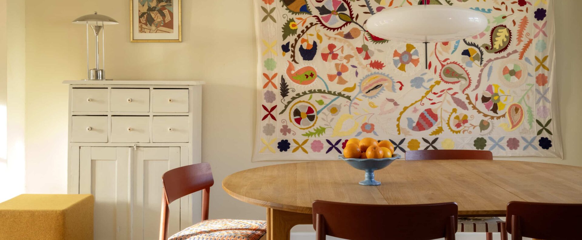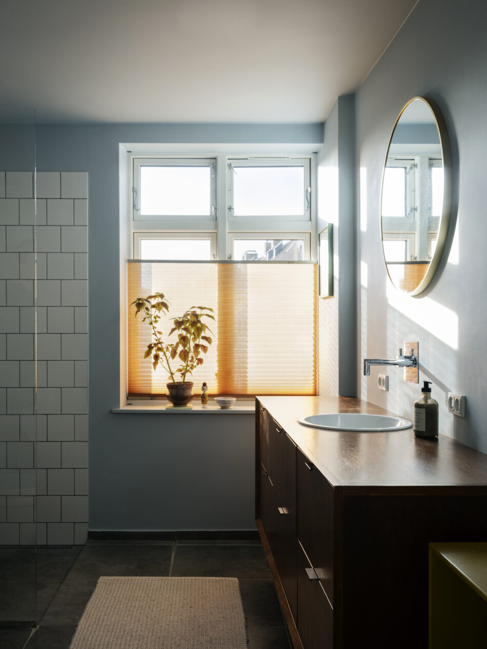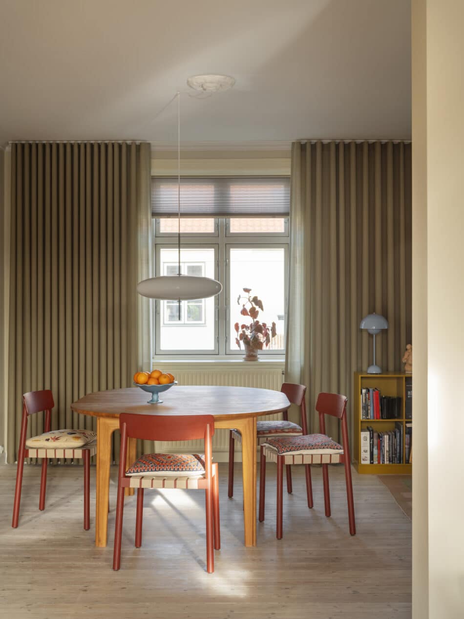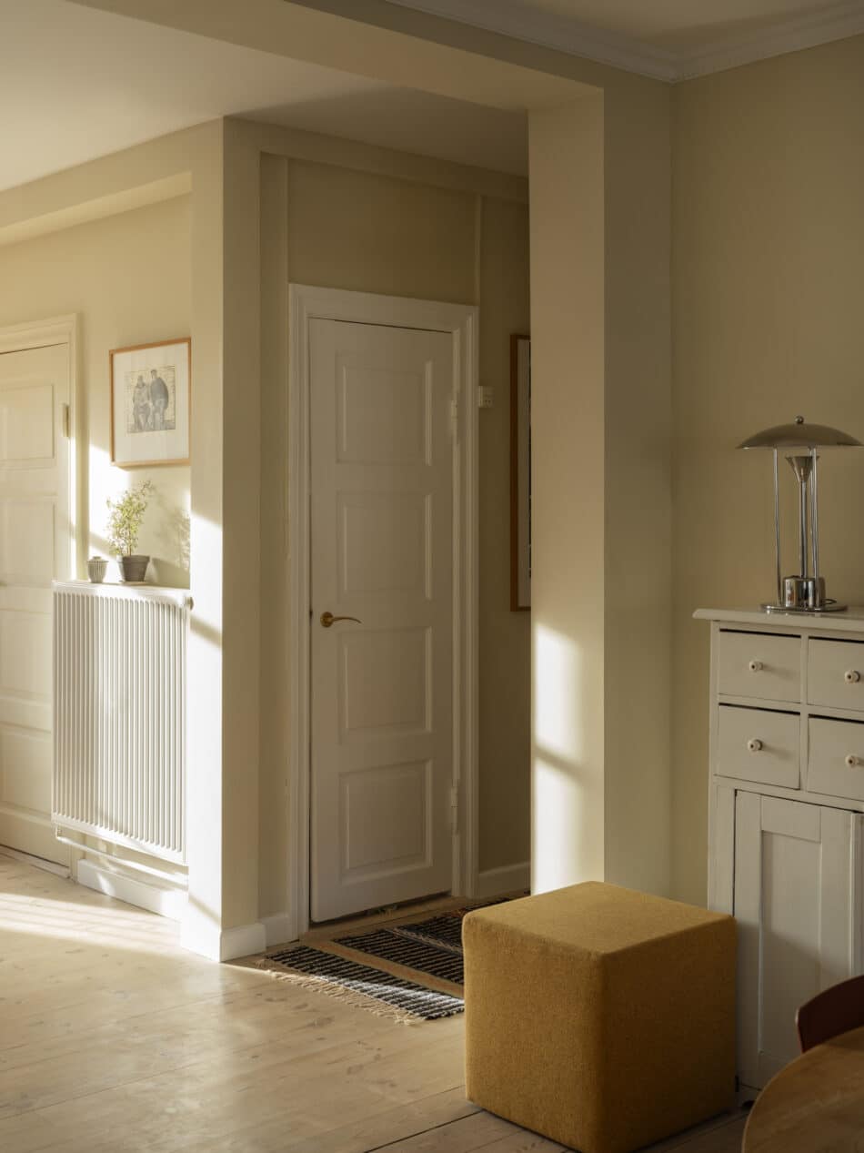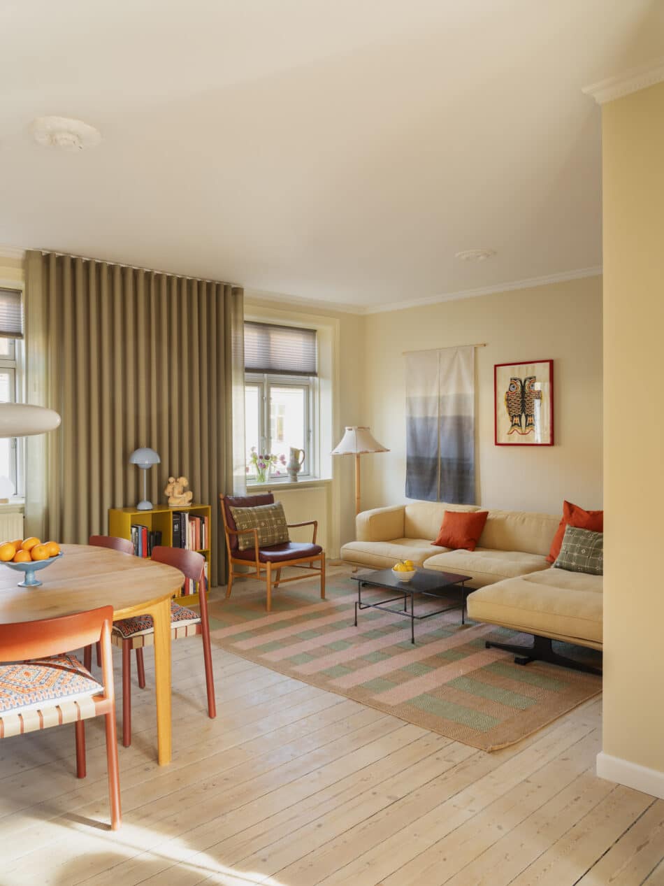 Hun var for nylig så privilegeret at få lov til at vælge nye vægfarver og gardiner til hele lejligheden i samarbejde med Flügger og Kurage gardiner.”Min tilgang har været at lade elementer fra vores eksisterende interiør blive toneangivende for de nye farver og tekstiler – for eksempel vores elskede egetræskøkken, vores nye, gule sofa fra &Tradition i stuen og det blå linoleumsklædeskab i soveværelset. Først lagde jeg farvepaletten for det enkelte rum, og derefter justerede jeg farverne, så der blev en fin sammenhæng på tværs af rummene. Jeg elsker den varme sandfarve, der går igen mellem køkken, stue og spisestue.”
