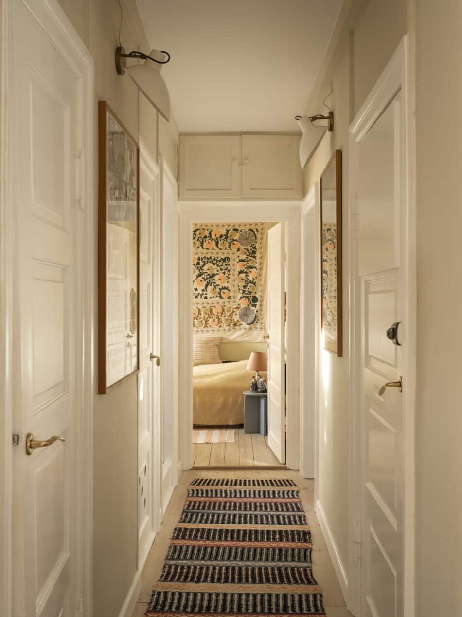 Den lange fordelingsgang afslører, at lejligheden engang var to, der nu er slået sammen. Løberen og lamperne er begge vintagefund, mens  vægtæppet, der egentlig er et sengetæppe, er fundet hos Craft Sisters i Jægersborggade. Det lille blå bord er fra Jysk.