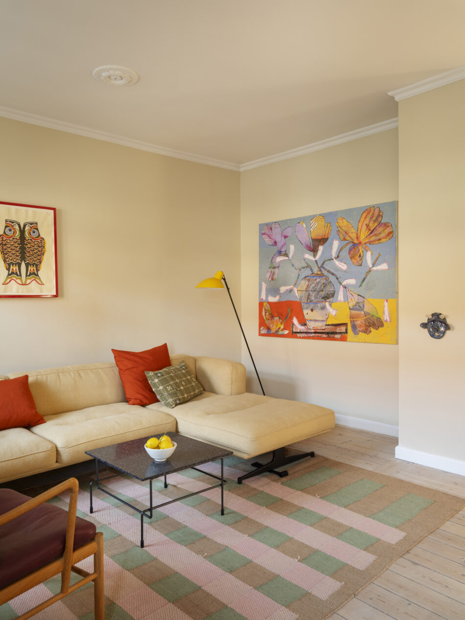 Den smukke, gule sofa fra &Tradition kom til, da familien voksede – her kan alle sidde sammen. Gulvtæppet i pastelfarver er fra Matias Moellenbach, og sofabordet er fra Magis. Lænestolen, der er skabt af Ole Wanscher, er fra Carl Hansen & Søn. Standerlampen er vintage, mens tekstilværket og det med fiskene begge er fra den japanske butik Sakura.