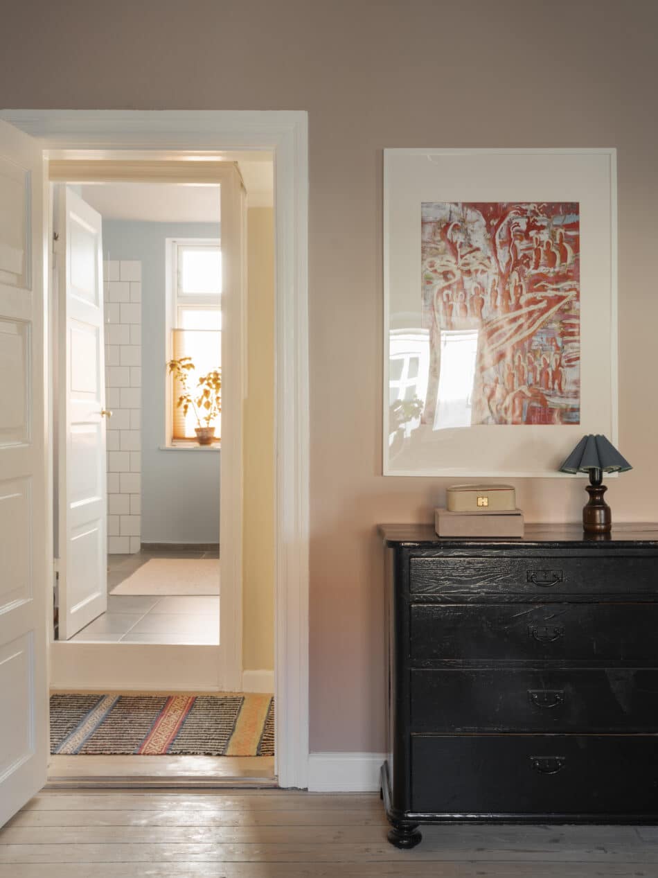 Et kig fra soveværelset gennem gangen mod badeværelset afslører Josefines sans for farvesammensætninger. Den sorte skænk er vintage, som Josefine selv har malet, og lampe såvel som værk er vintagefund.