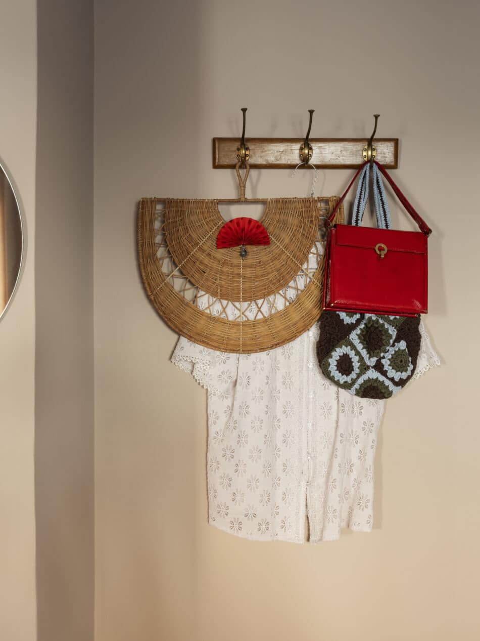 Et lille tableau i soveværelset med en vintage knagerække og en smuk vifte i rattan fra Sakura. Den lille røde vifte er købt med hjem fra en rejse til Italien, mens skjorte og tasker er vintage.