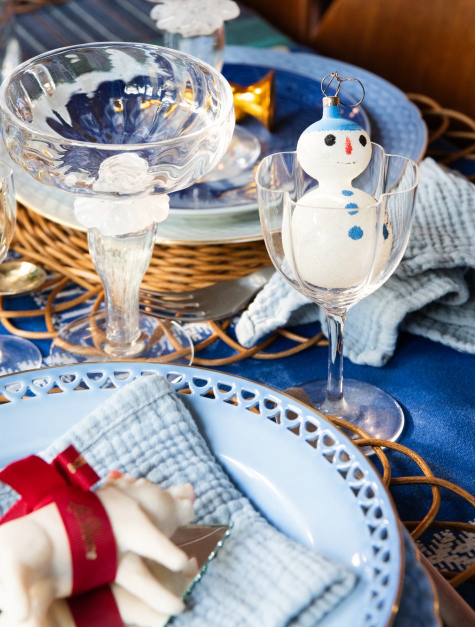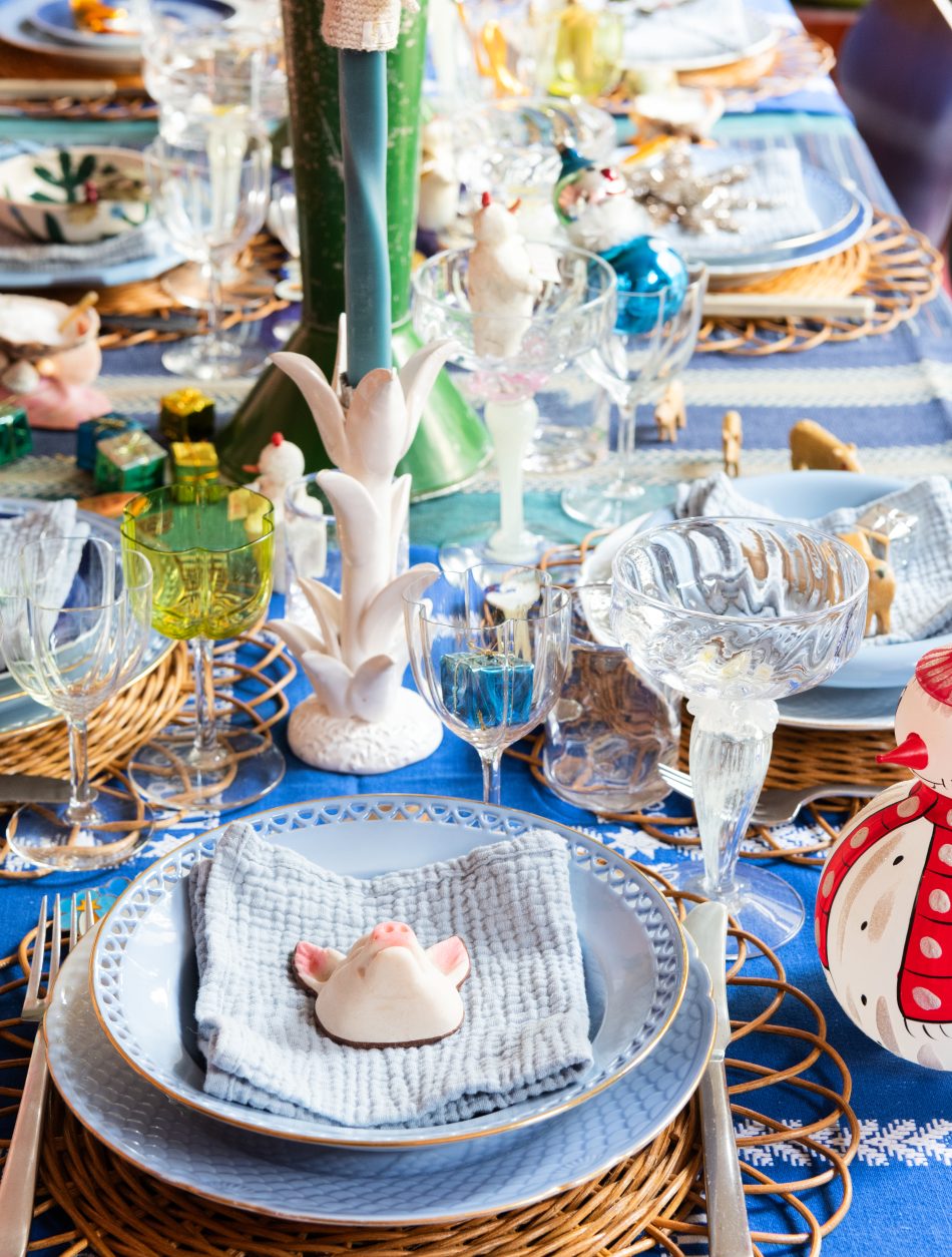 Umagen bag det smukt opdækkede julebord vidner ifølge Helle om, at man har glædet sig til, at ensgæster skulle komme. Det er dækket med et mix af nye og gamle tallerkener fra bl.a. Royal Copenhagen, Bing og Grøndal og Hay. De mange glas er fra hhv. Frama, Créme de la Créme à la Helle x Nina Nørgaard og gaver fra filminstruktør Lone Scherfig. Dugen er sammensat af mange forskellige og syet sammen til en.