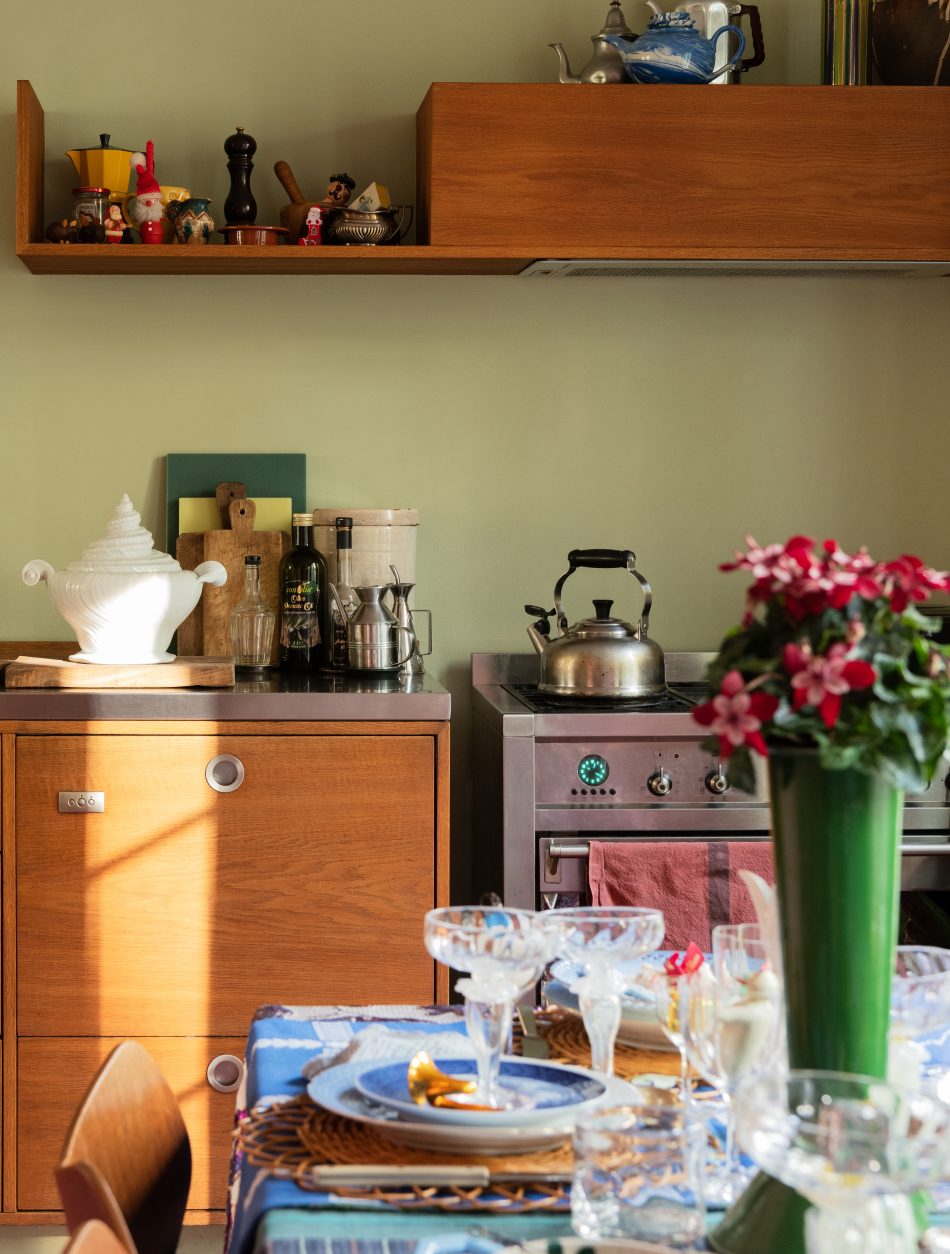 Køkkenet fra Design by Us fik parret lavet, da de købte huset for mere end 20 år siden. Det er lavet efter et gammelt Tectum-køkken. På køkkenbordet står bl.a. en stor terrin fra Royal Copenhagens Konkylie-stel, som parret fik i sølvbryllupsgave af Jonas’ mor.