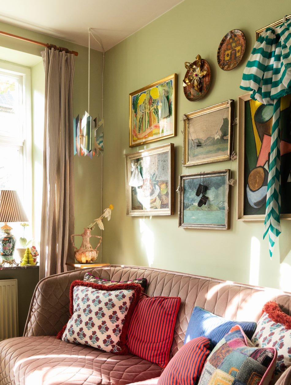 Over den lyserøde sofa, som Helle har fundet hos The Apartment, hænger – på grøntmalede vægge – en masse blandende malerier. ”Jonas far havde et galleri i Veksø, så han har arvet sansen for malerierne og finder mange af dem,” fortæller Helle Høgsbro Krag, der egentlig godt kan lide at flytte, men som de seneste 22 år har måtte ”nøjes” med at rykke rundt på de i alt fire etager i huset og male væggene i nye nuancer.