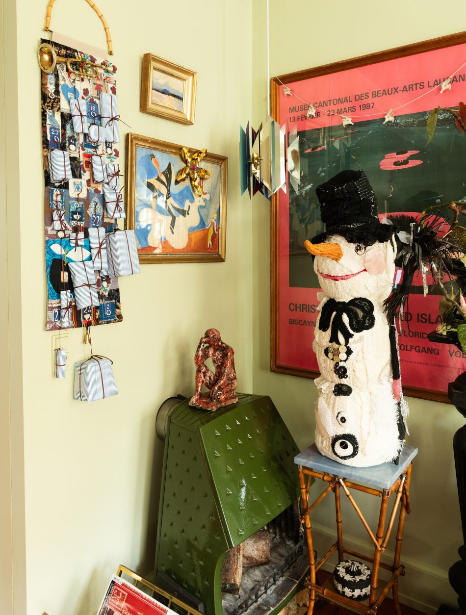 Fra det overdådige julebord dækket med et mix af bl.a. det klassiske Mågestellet og nye moderne tallerkener fra Hay samt Helles egne daisy-champagneglas skabt i samarbejde med glaskunstner Nina Nørgaard til tekstilsnemænd med stoffer fra bl.a. Heartmade og Sea New York, guirlander, juletræer og sløjfer: Her jules overalt. Faktisk er der generelt ting overalt, og da parret for få år siden fejrede sølvbryllup, sluttede en af gæsterne ved morgenbordet da også sin tale med at sige, at alle gerne måtte tage en ting med, når de gik.