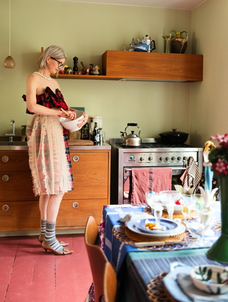 ”Men jeg ved, hvor alt kommer fra,” siger Helle, ”og tingene er meget mere værd for mig, når jeg kan huske, hvem jeg har fået det af, eller hvor jeg har bragt det hjem fra.” På det yndigt opdækkede julebord står gule glas modtaget i gave fra filminstruktør Lone Scherfig, der stammer fra det svenske slot Helgerum, som Lone ejer, på sofabordet et kunstigt juletræ, som Helles veninde Bibi Werner (tidligere ejer af modebutikken Holly Golightly, red.) har bragt med hjem i håndbagagen fra New York, og på køkkenbordet en stor terrin fra Royal Copenhagens udgåede Konkyliestel, som Helle og Jonas fik i sølvbryllupsgave af Jonas’ mor. Parret nyder også at købe ting med hjem fra loppemarkeder i især Paris og Italien, og købte engang så meget, at det måtte fragtes hjem med et frugtfirma, der alligevel skulle til Danmark. Spisebordet er fx fra Merci i Paris, mens lerkrukkerne i køkkenet er fundet på markeder i Puglia.