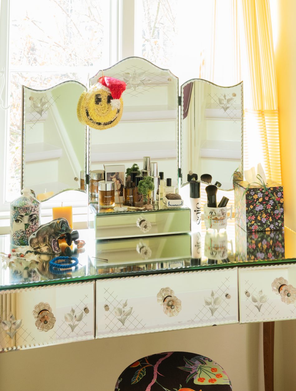 Sminkebordet er fra Fil de Fer, mens skamlen er fundet på et loppemarked og ombetrukket med stof fra Svenskt Tenn.