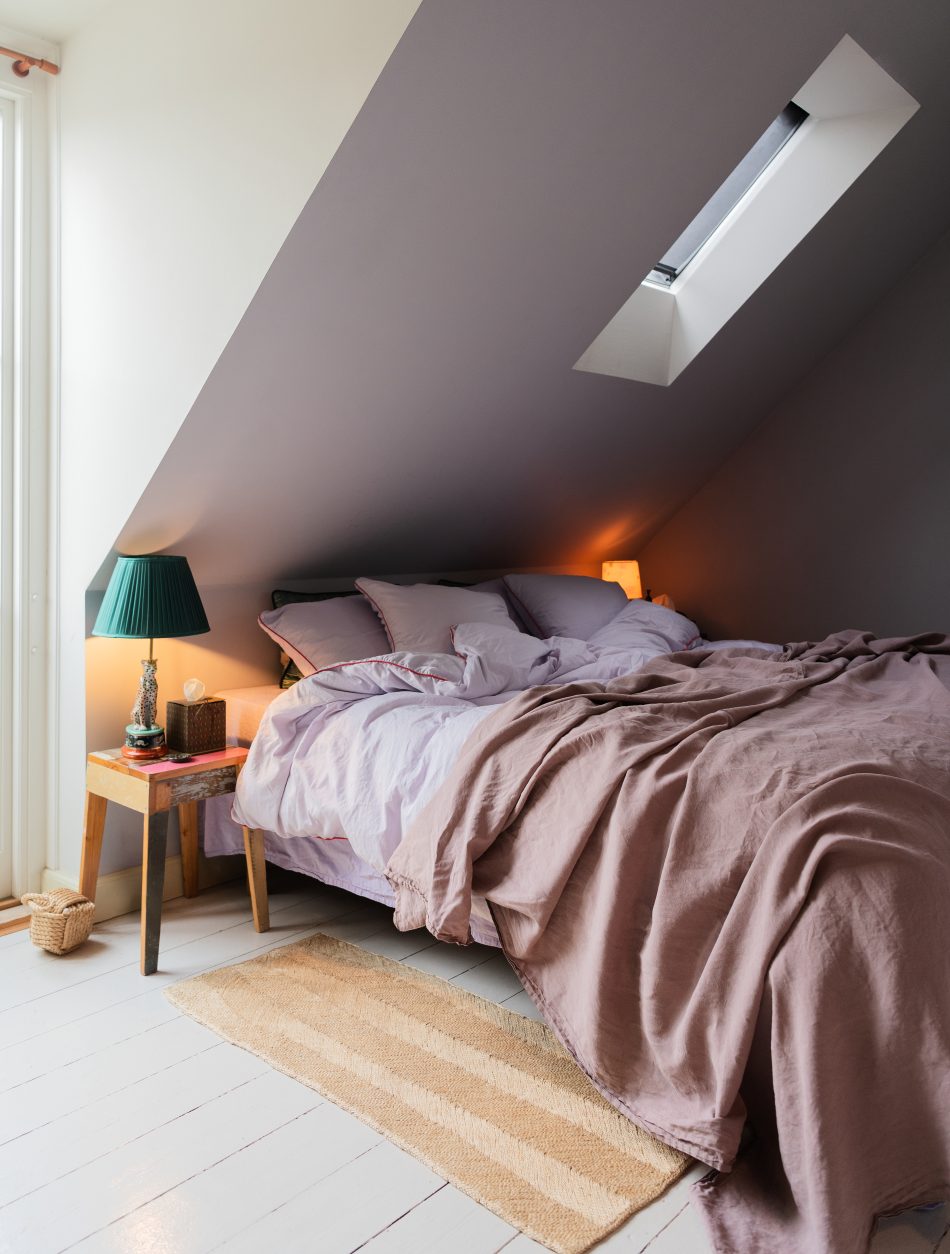 Øverst oppe i huset på fire etager har parret indrettet soveværelse. Sengetøjet er fra Hay, og Helle elsker den delikate røde kant. Sengebordet er Piet Hein.
