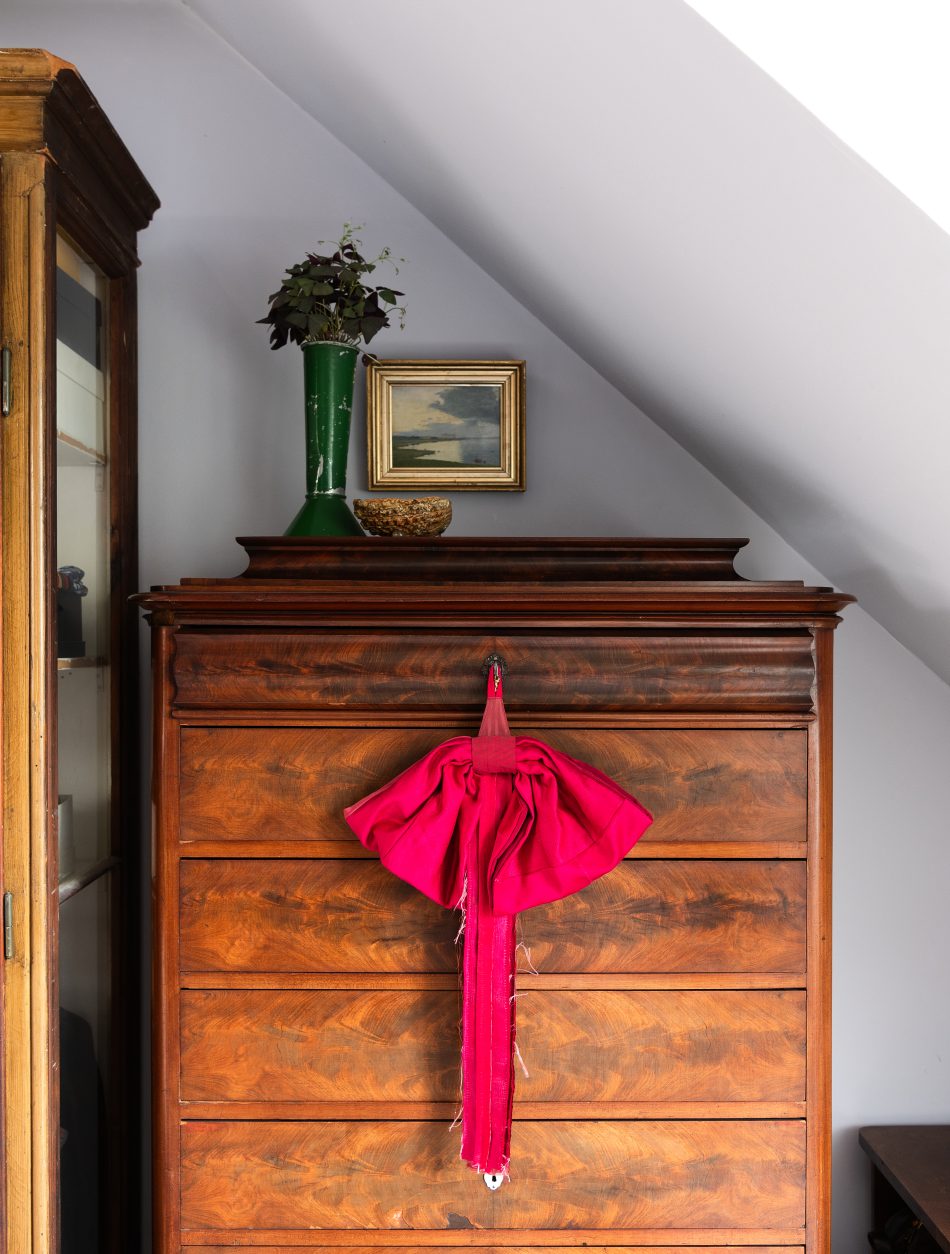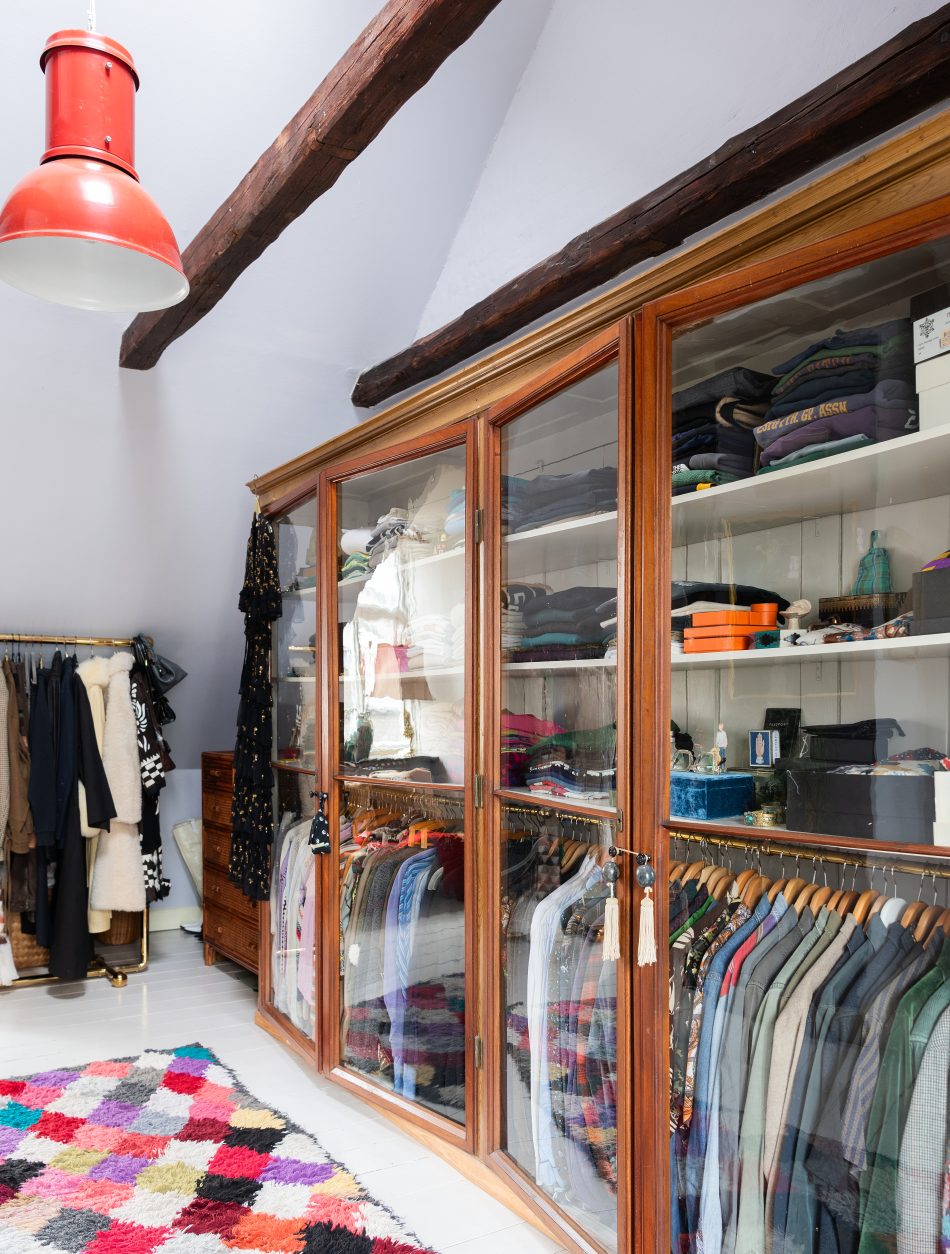 Det store klædeskab er fra Geologisk Museum. Helle havde en bekendt, der arbejdede der, og derigennem fik hun nys om, at det skulle smides ud. Hun har sidenhen fået sat hylder og bøjlestænger i.