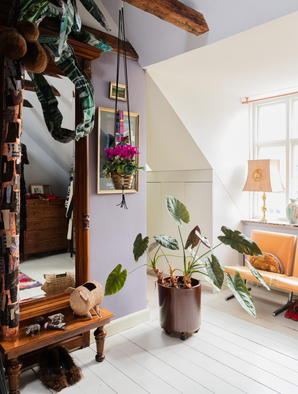 Når man træder indenfor i det klassiske Kartoffelrækkehus på Østerbro i København, hvor designer Helle Høgsbro Krag og guitarist Jonas Krag har boet de seneste 22 år, vil mange nok tro, at det er Helle, der står for indretningen. Her er nemlig ikke sparet på noget: Farver, tapeter og tæpper lever side om side med malerier, plakater og planter, mens tekstiler, gardiner og lamper sætter prikken over i’et. Men selv om her, som Helle beskriver det ”er temmelig lyserødt,” er passionen for indretning altså fælles for parret.