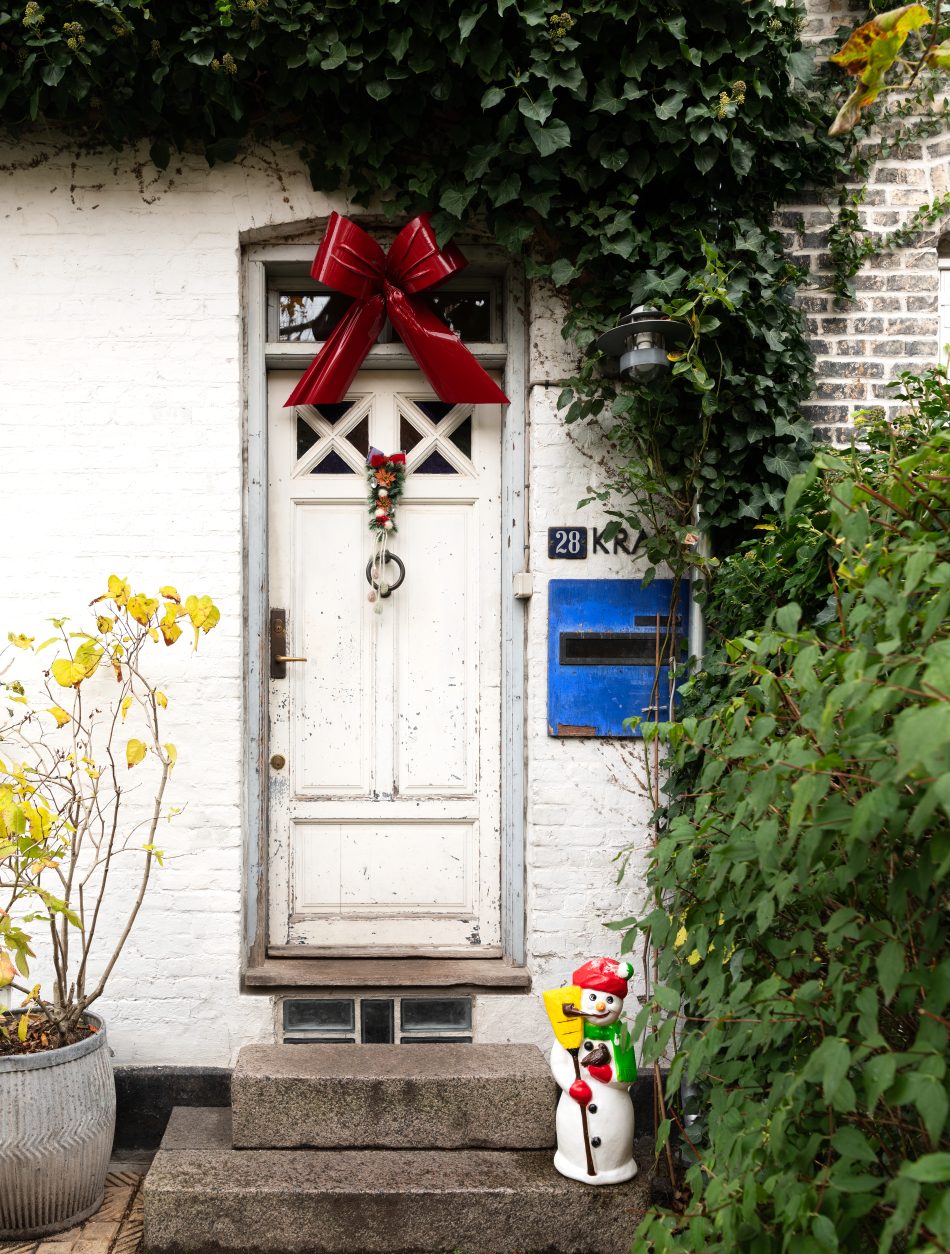 Der jules helt ude på gaden, hvor Kartoffelrækkehuset er pyntet med hhv. sløjfe og snemand.