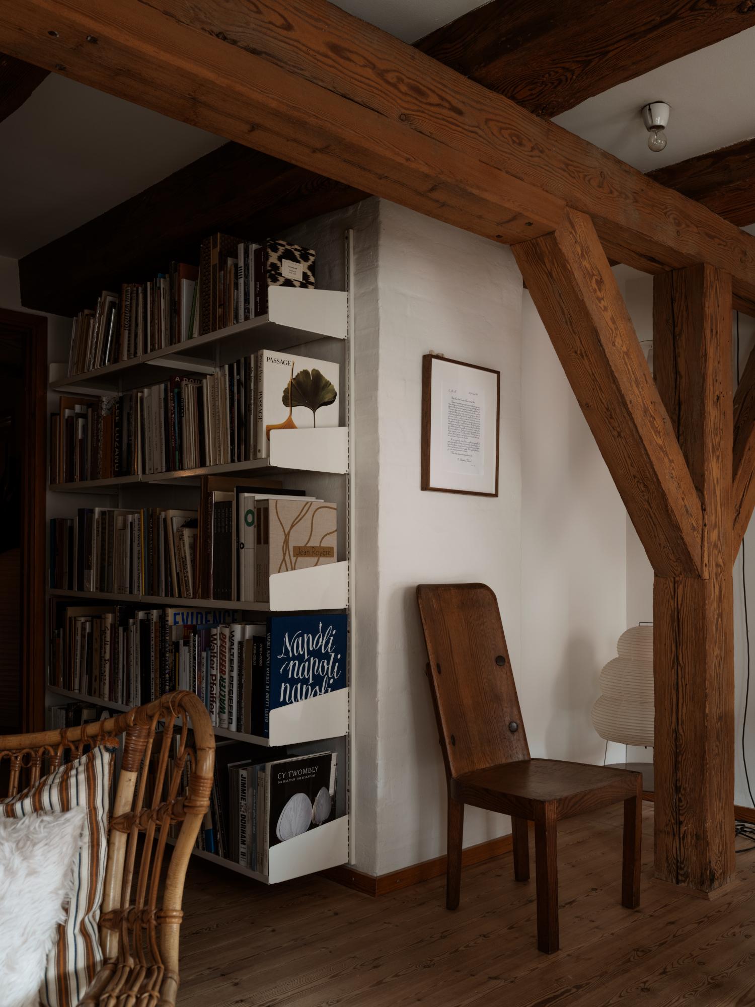 De store bjælker, der vidner om bygningens tid som pakhus, dominerer udtrykket I lejligheden. Her får de modspil af en Lovö-stol designet af svenske Axel Einar Hjorth og en lampe I rispapir af Isamu Noguchi. Bordet, den står på, er tegnet af arkitekten de Vylder Vinck Taillieu, hvor Alexander var I praktik