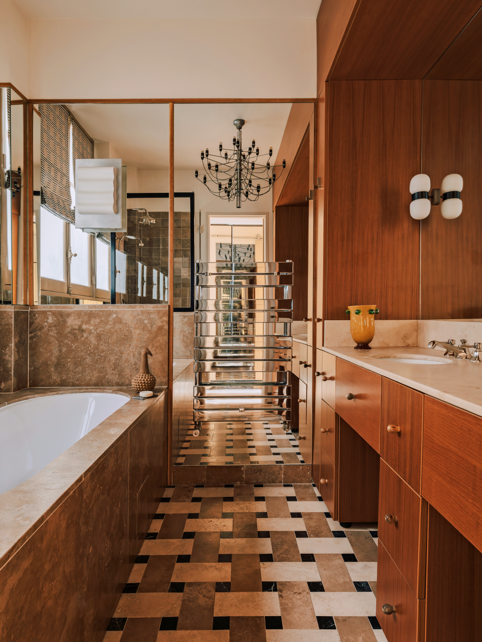 Spejl- og træpanelerne afspejler elegancen i badeværelset, hvor travertin er i fokus – både i gulvets layout, badekarrets beklædning og den specialfremstillede bordplade. Alt fra Tuscan & Tradition og baseret på træfinermøbler. Tre lamper fuldender den raffinerede indretning med, fra venstre mod højre, væglampen Frame OW af Violaine d’Harcourt, et ophæng af Gino Sarfatti fra Flos og væglampen Nuvol Double af Mauricio Obarrio fra Contain. Hvad angår farver, fordybede Julia Rouzaud sig i fotografierne af Yves Saint Laurent og Pierre Bergés bolig fra i 70’erne på Rue de Babylone og tilegnede sig den gennemgående palette af beige, træ og creme.
