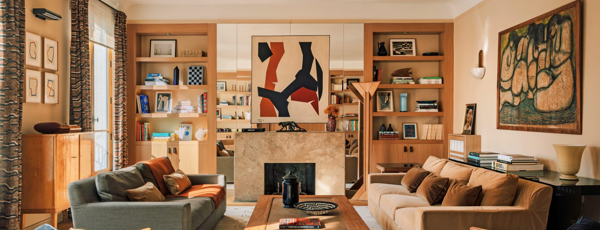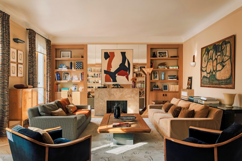 I den art deco-inspirerende stue fik Julia Rouzaud travertinpejsen lavet efter mål hos Toscana & Tradition med udskårne spejle i 1930’er stil som baggrund. Den er omgivet af bogreoler, hvori en vase af Eltore Sottsass, skandinavisk keramik og geometriske litografier af den italienske maler Alberto Magnelli står. I midten et maleri af René Roche. I forgrunden åbner de marmorerede og ombetrukkede sorte lænestole rummet op til to sofaer, der også er ombetrukket, og en gammel opiumseng omdannet til et sofabord. På toppen står Albarello-potten fra Cosein-corso og en colombiansk kurv lavet af Werregue-palmefibre. Til venstre, oven på et svensk møbler fra 1930’erne, fire gouacher af Géraldine Roussel. Modsat står et billede fundet på et loppemarked og en væglampe af Johanna de Clisson hos Hiromi. Tæppet er fra Nordic Knots.
