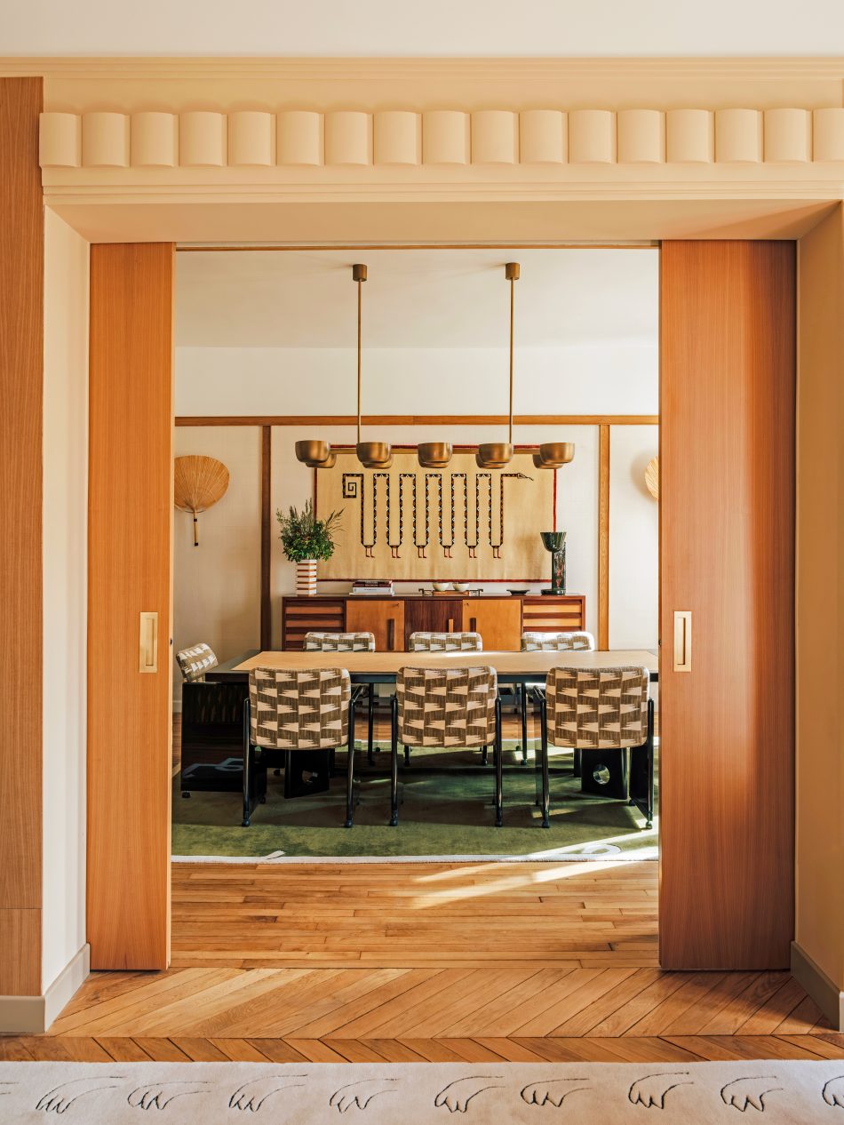 Over rammen på skydedørene, der åbner ud til spisestuen, har Julia Rouzaud genskabt den liste, der pryder indgangen til bygningen. Omkring det special lakerede bord blev de lakerede træstole af Kazuhide Takahama ombetrukket med Tutsi-fløjl af David Kaihoi for Schumacher. Over skænken fra 1950’erne og på væggen med paneler af hør og silke, nærmere bestemt Dedarstof, er der dyretapeter fra Les Editions de Tapis og et sæt bambuslampetter, Uchiva, fra 1970’erne af Ingo Maurer. Messing ophænget er Carmela fra Danke Galerie.