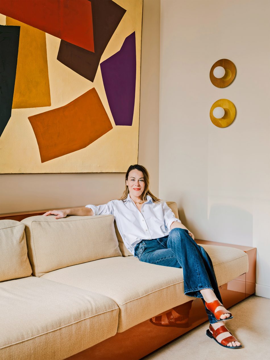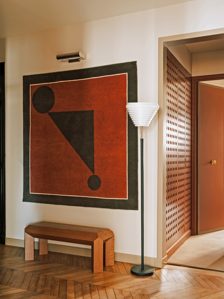 Trendsætter Julia Rouzaud tager også selv fat og designer møbler. I hjemmet ses hendes orange lakerede træsofa. På væggen hængeret maleri af René Roche og et par væglamper fra serien Disc and A Sense of Detail. Grafiske linjer præger indgangen mellem tæppet, der hænger som et gobelin fra Les Editions de Tapis, sofabordet ”45”, der er blevet til en bænk lavet af Carvalho-fineret lamelplade signeret af Cara Davide fra Vero International, og gulvlampen Angel Wing fra 1954 af Alvar Aalto hos Artek. Til højre står et specialfremstillet skab med bikageformet panel og kontordør dekoreret med pynt fra Schumacher.