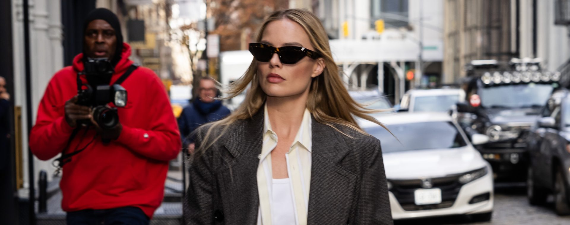 Det er bestemt ikke en ny ting, at Margot Robbie har fundet tryghed i en oversize blazer, blå jeans og en basic top – her tilbage i 2022 bare hun selvsamme look.