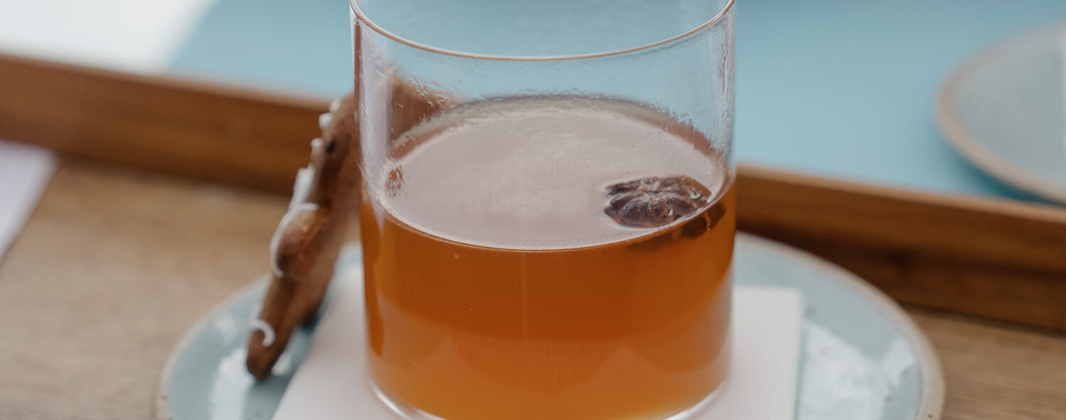 Hjørnet, som Christina Ivang og Mathias Smeds spisested, vinbar og mikrokonditori hedder, åbnede nemlig i år, og før du lægger din tur forbi i næste weekend, er det måske værd at nævne, at stedet ligger i Svaneke på Bornholm. Derfor er vinder-gløggen også inspireret af netop Solskinsøens sanke-muligheder som figenblade, fennikeltoppe og hyldeblomst. Det har efterladt en gløgg med masser af frugt, knald på krydderierne og god saftighed.