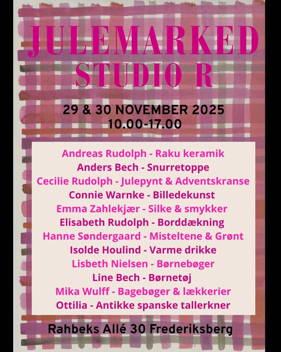 I kælderen hos Studio R inviteres der endnu engang indenfor til julemarked, hvor du bl.a. kan shoppe julepynt og kranse fra Cecilie Rudolph, antikke tallerkner fra Ottilia samt alt i keramik, borddækning og billedkunst – mens du også kan hygge og lune dig på varme drikke.