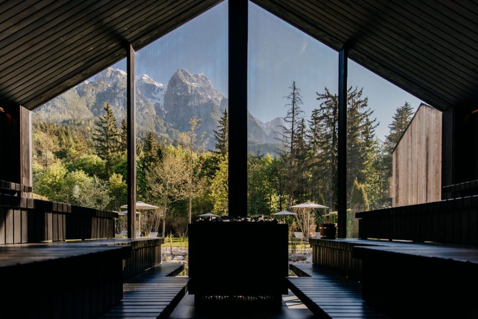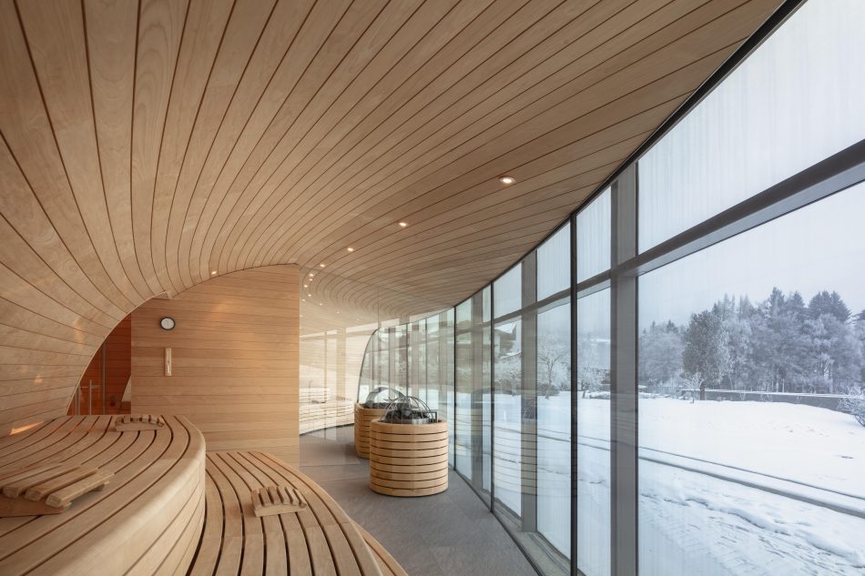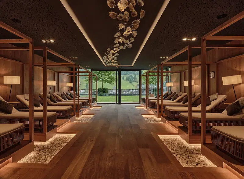 Indendørs venter – fordelt over to etager – koldtvandsbassin, blålysgrotte-pool, flere saunaer – herunder finsk sauna, urtesauna og dampbad, hvor du kan deltage i daglige gussessioner – samt stilleområder med udsigt til bjergene, hvor du kan nyde en kop kaffe eller en drink fra caféen. Dette område er for voksne, men hotellet tilbyder også en lige så imponerende afdeling med pool og faciliter for både børn og voksne.