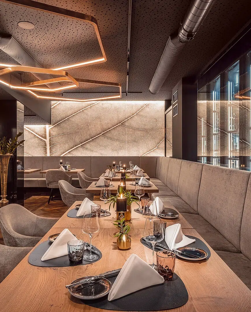 Til aften serveres en dagligt skiftende treretters menu, som du kan sammensætte af forskellige retter, der dækker tre kategorier; den alpinske menu med råvarer fra de syv alpelande, den lokale menu, hvor alle råvarer er fra en radius på maks 50 km, og den veganske. Hertil kommer en generøs salatbar, oste og brød, så du rent faktisk kan gå derfra med en femretters i maven.