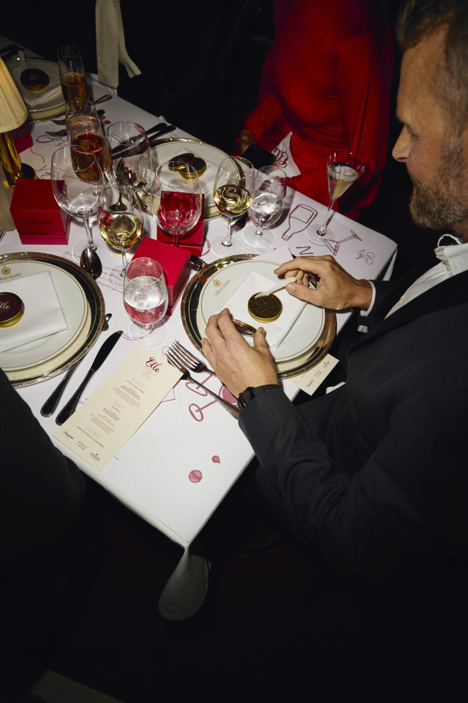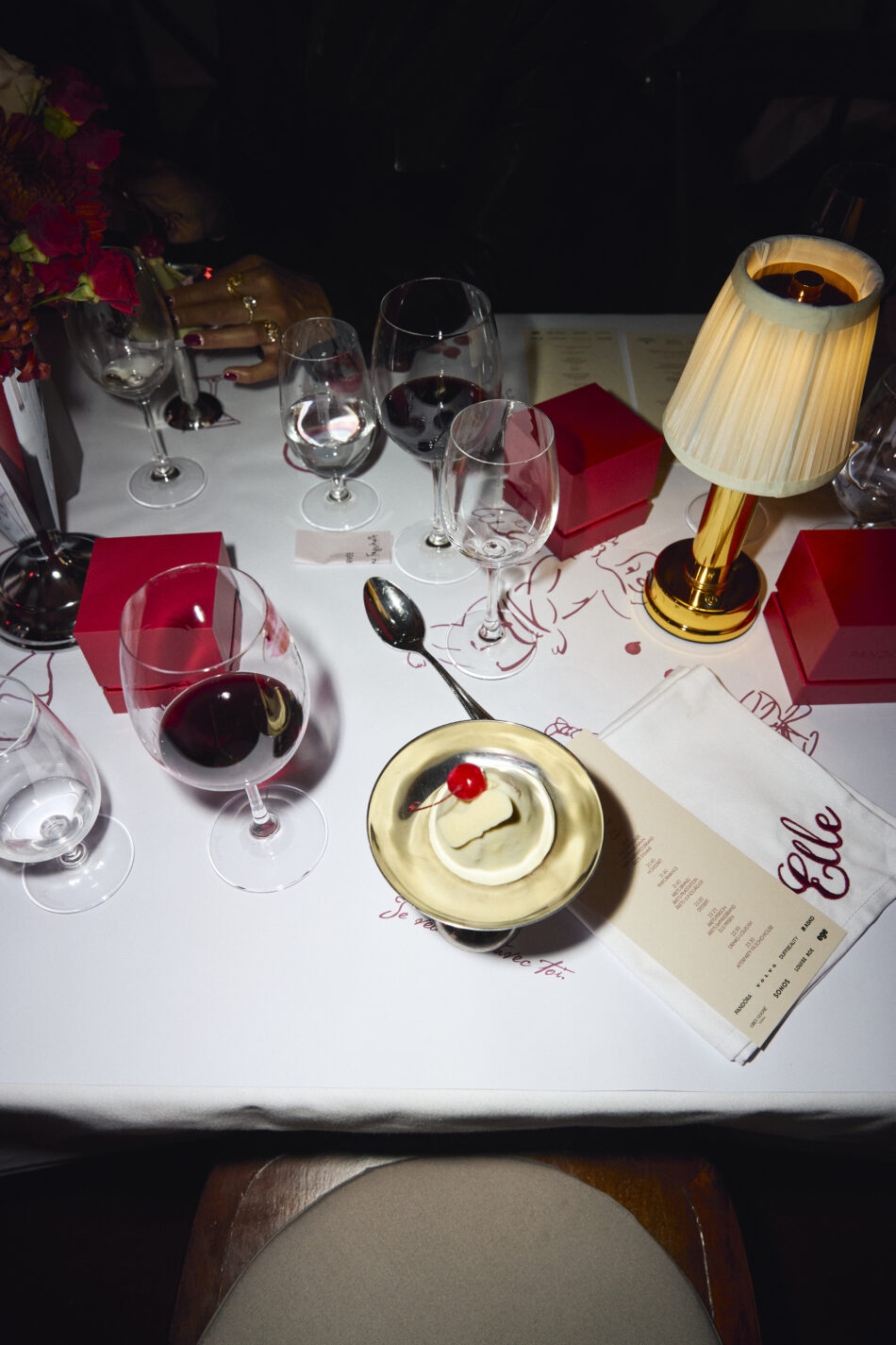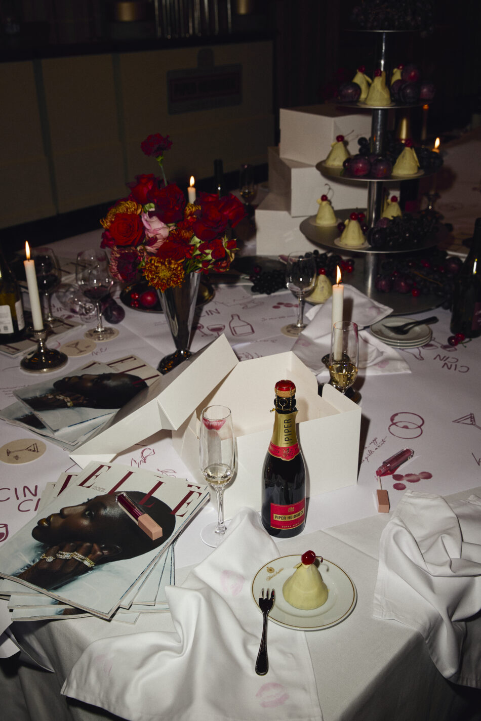 Et overflod af pariserlækkerier: Champagne fra Piper-Heidsieck, ELLE-magasiner med en særlig Pandora-forside skabt til aftenen, stager fra Louise Roe, desserter fra Summerbird og lipgloss fra Duffbeauty.