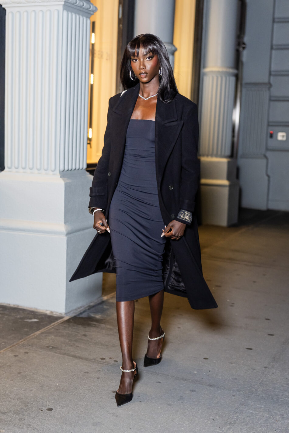 Model Anok Yai trådte forleden ud i New Yorks gader i en stram, grå, knælang kjole med en lang sort blazer-jakke og et par elegante hæle til. Et look, som er nemt at kopiere, fordi det består af få dele, som egenligt kan adopteres på forskellige måder, hvad end du drømmer om at dresse det up med en pæn, cropped jakke og et tørklæde eller – for den sags skyld – ned med et par ballerinaer eller små hæle og en strik-cardigan. Og så kan kjole, sko og jakke jo nemt bruges i andre farver.