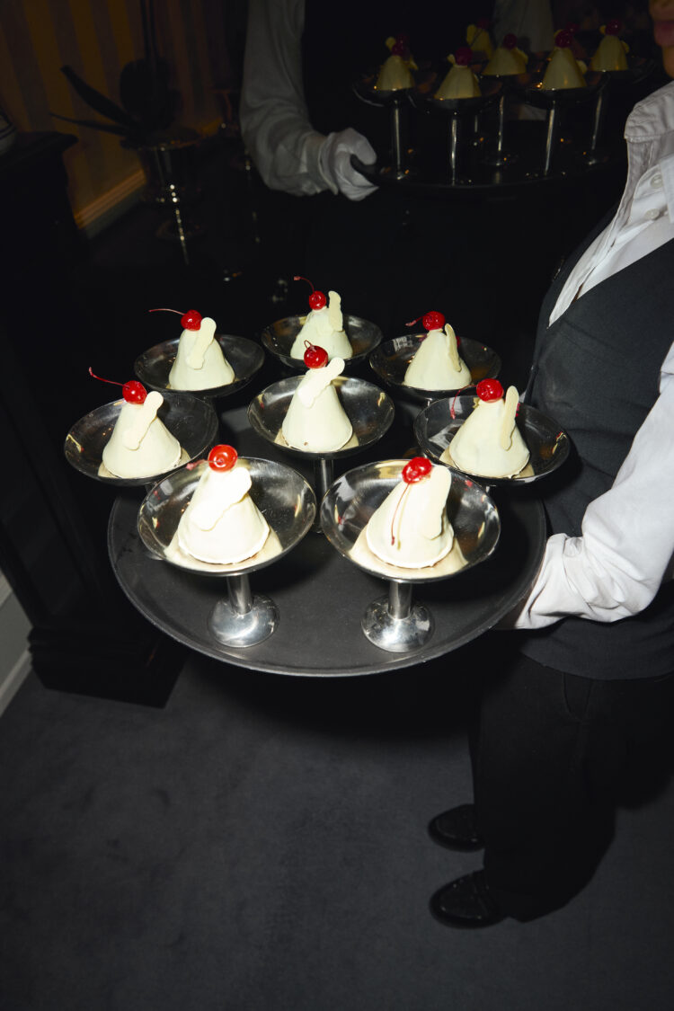 Chokolademousse, overtrukket med hvid chokolade og tilsat et cocktailbær – Summerbird tryllede den lækreste dessert, der blev serveret på smukkeste vis i sølv-coupes.