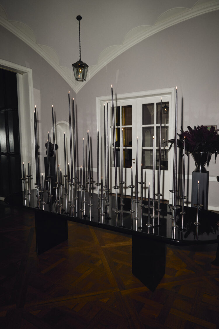Det første syn, der mødte gæsterne, var Pompei-salen på Hotel d’Angleterre, hvor Louise Roe satte stemningen med et smukt, sort langbord, dækket med massevis af lange, sorte stearinlys, der satte stemningen.