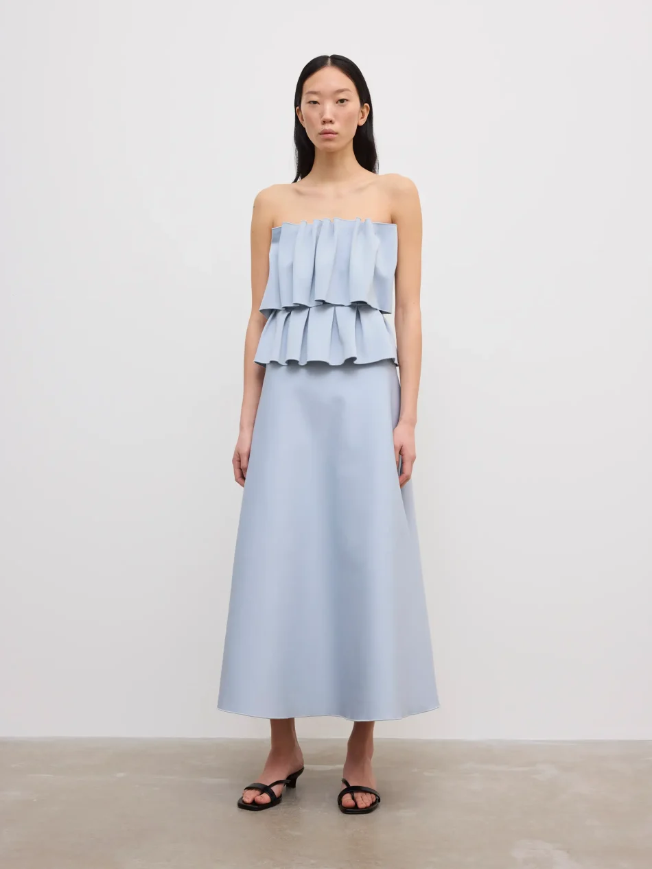 Lyseblå kjole uden stropper og med mønstret overdel, House of Dagmar, 4.630 kr.