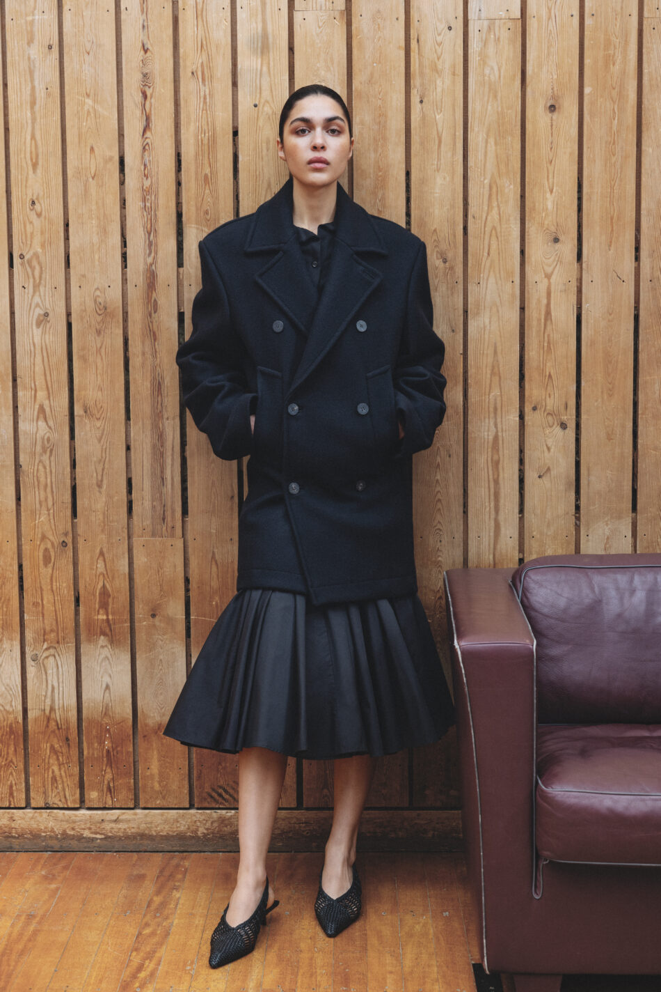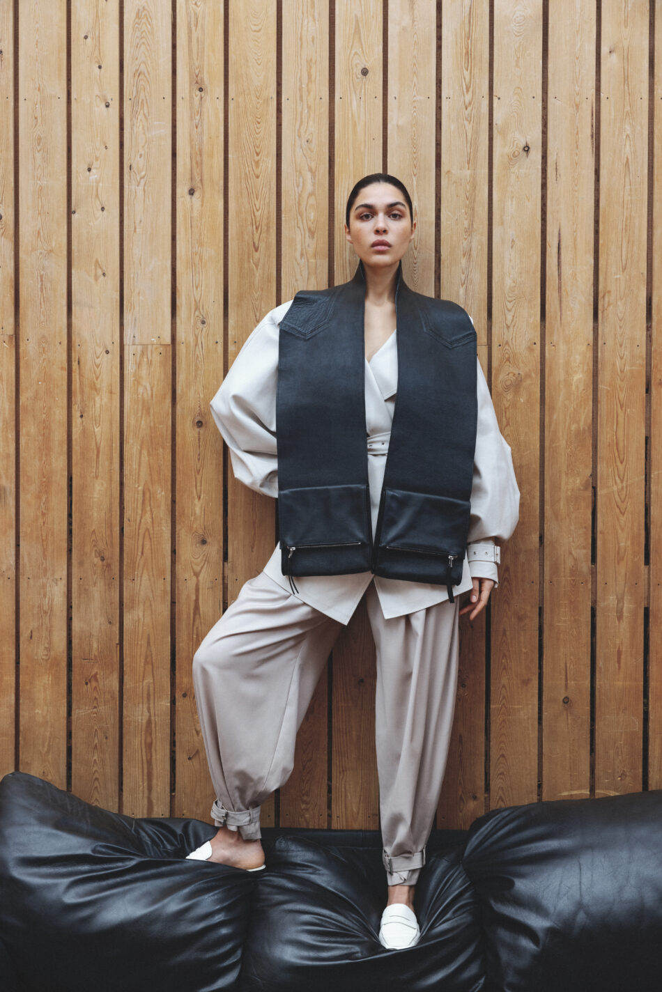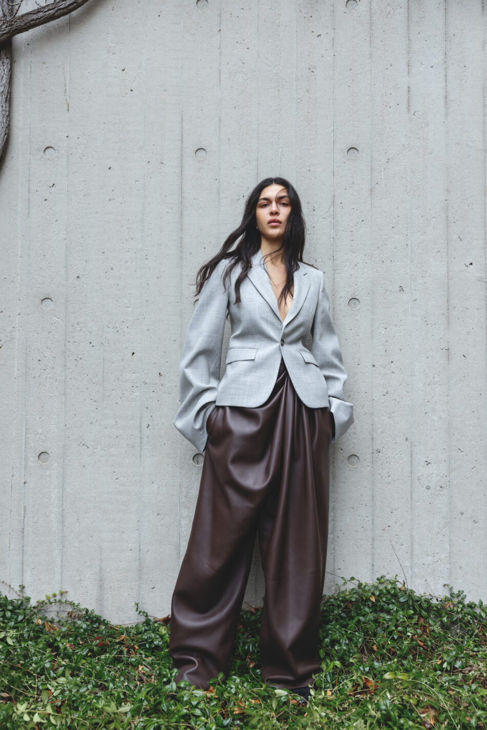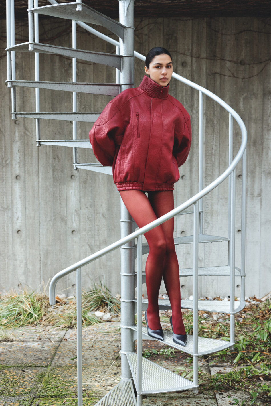 Læder i nuancer af chokoladebrun, smørgul og vinrød tager fokus, mens sporty referencer og nylonstrømper gør looket klar til efterår. Et par opsigtsvækkende sko sætter prikken over i’et.