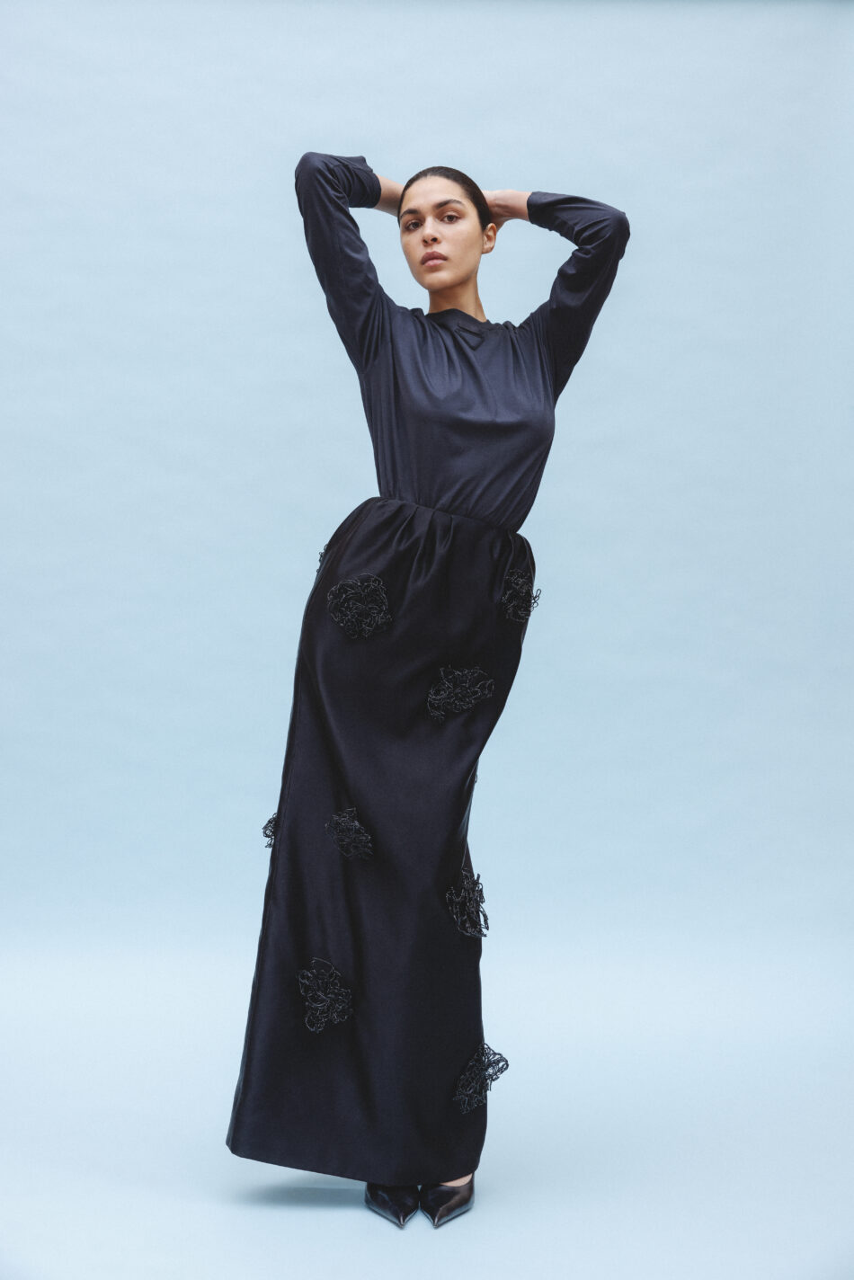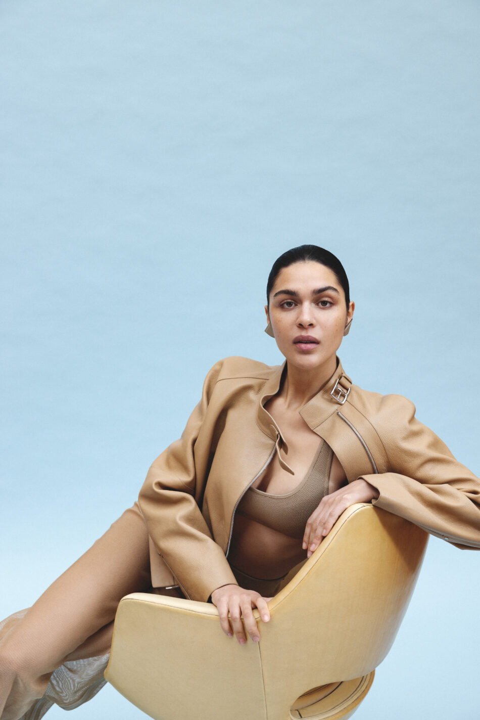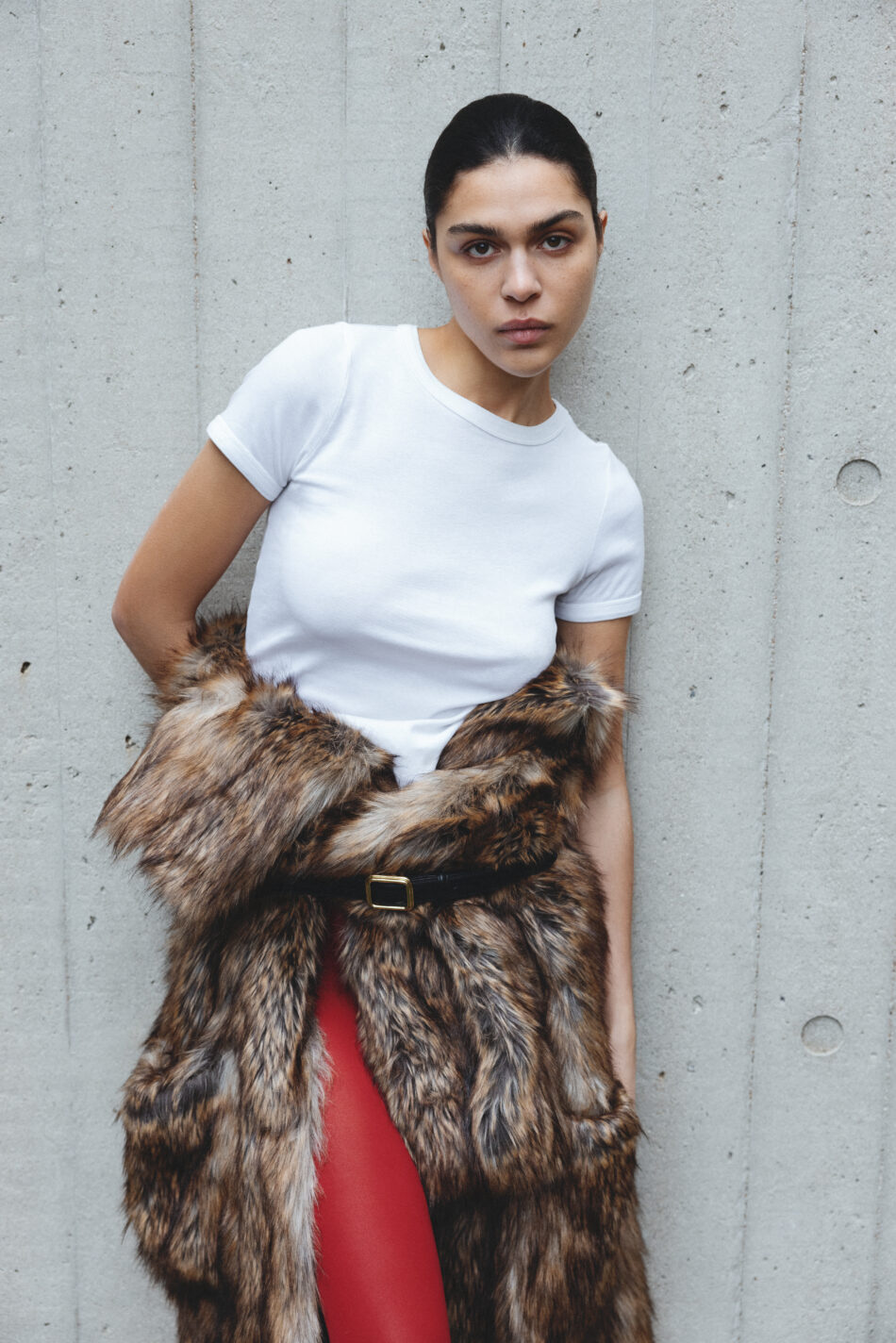 Læder i nuancer af chokoladebrun, smørgul og vinrød tager fokus, mens sporty referencer og nylonstrømper gør looket klar til efterår. Et par opsigtsvækkende sko sætter prikken over i’et.