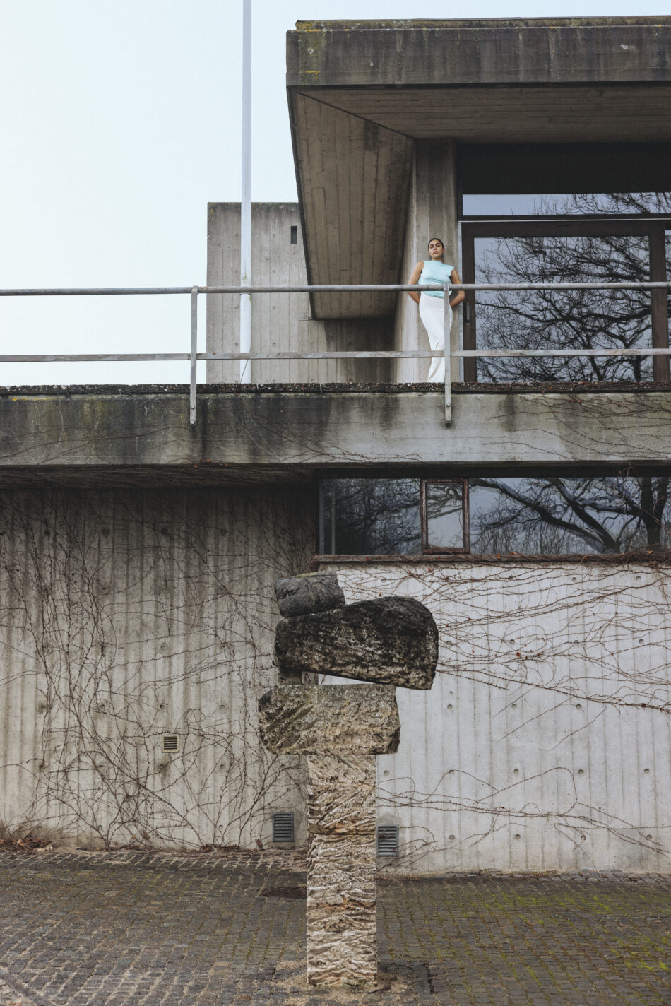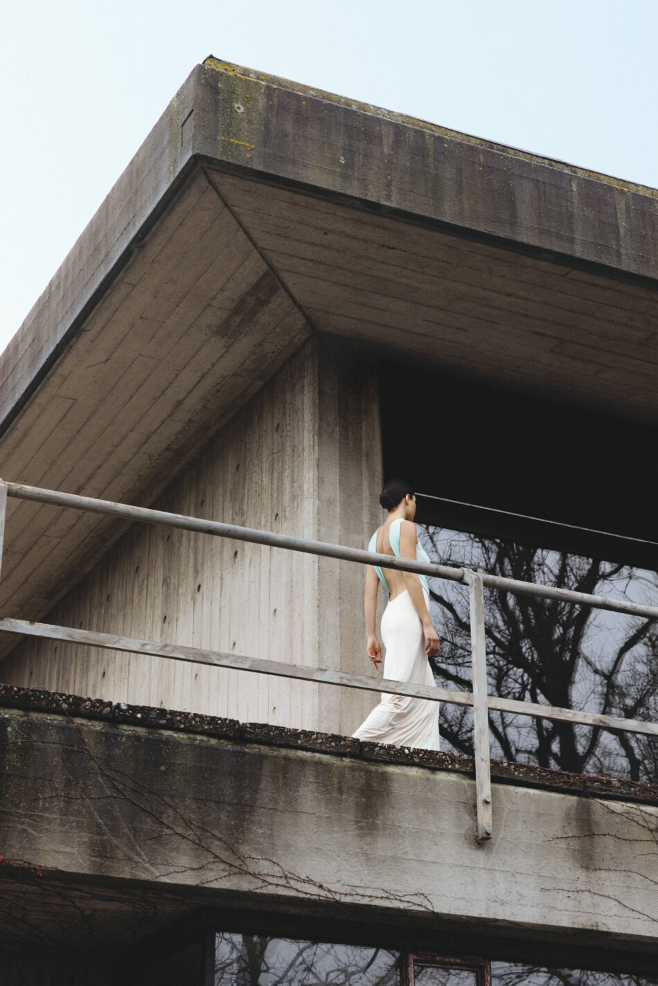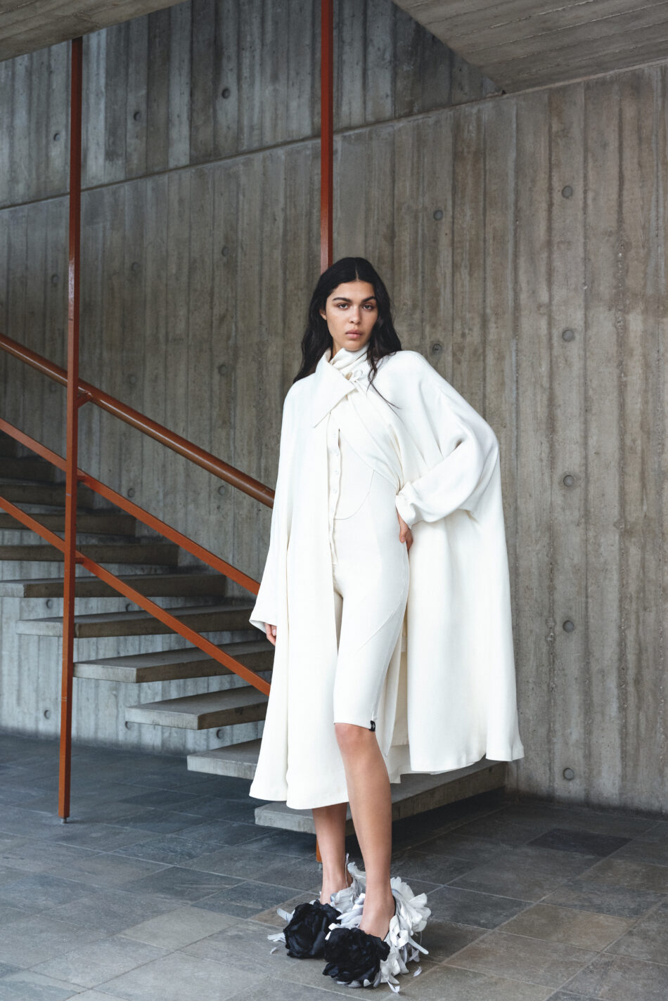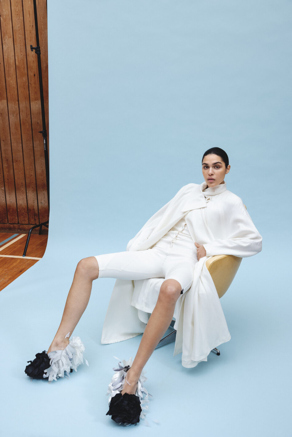 Læder i nuancer af chokoladebrun, smørgul og vinrød tager fokus, mens sporty referencer og nylonstrømper gør looket klar til efterår. Et par opsigtsvækkende sko sætter prikken over i’et.