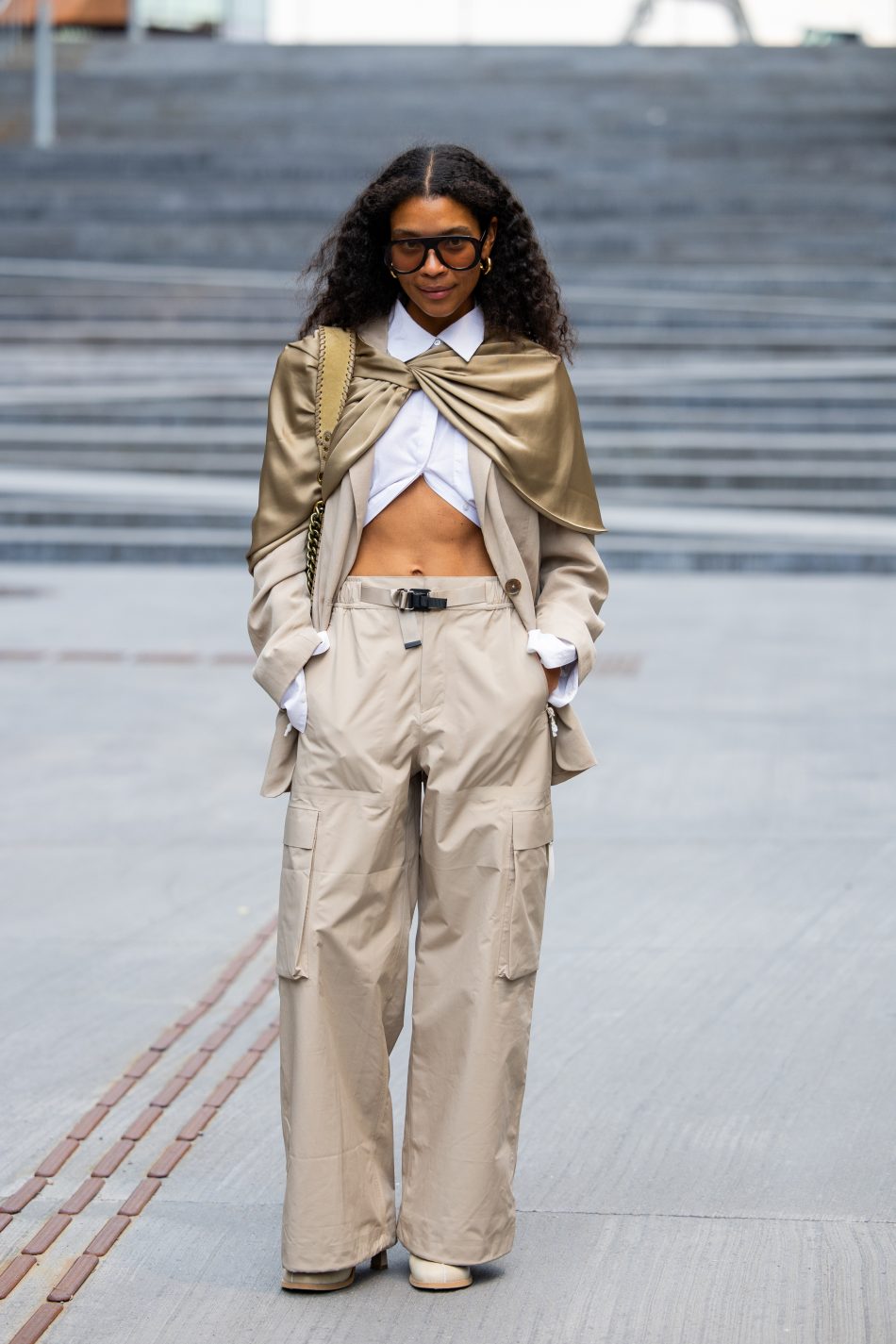 Cargo-bukserne i tech-materiale er også en mulighed – her stylet med et yndigt sjal, hvilket giver en fin kontrast mellem elegant og teknisk.