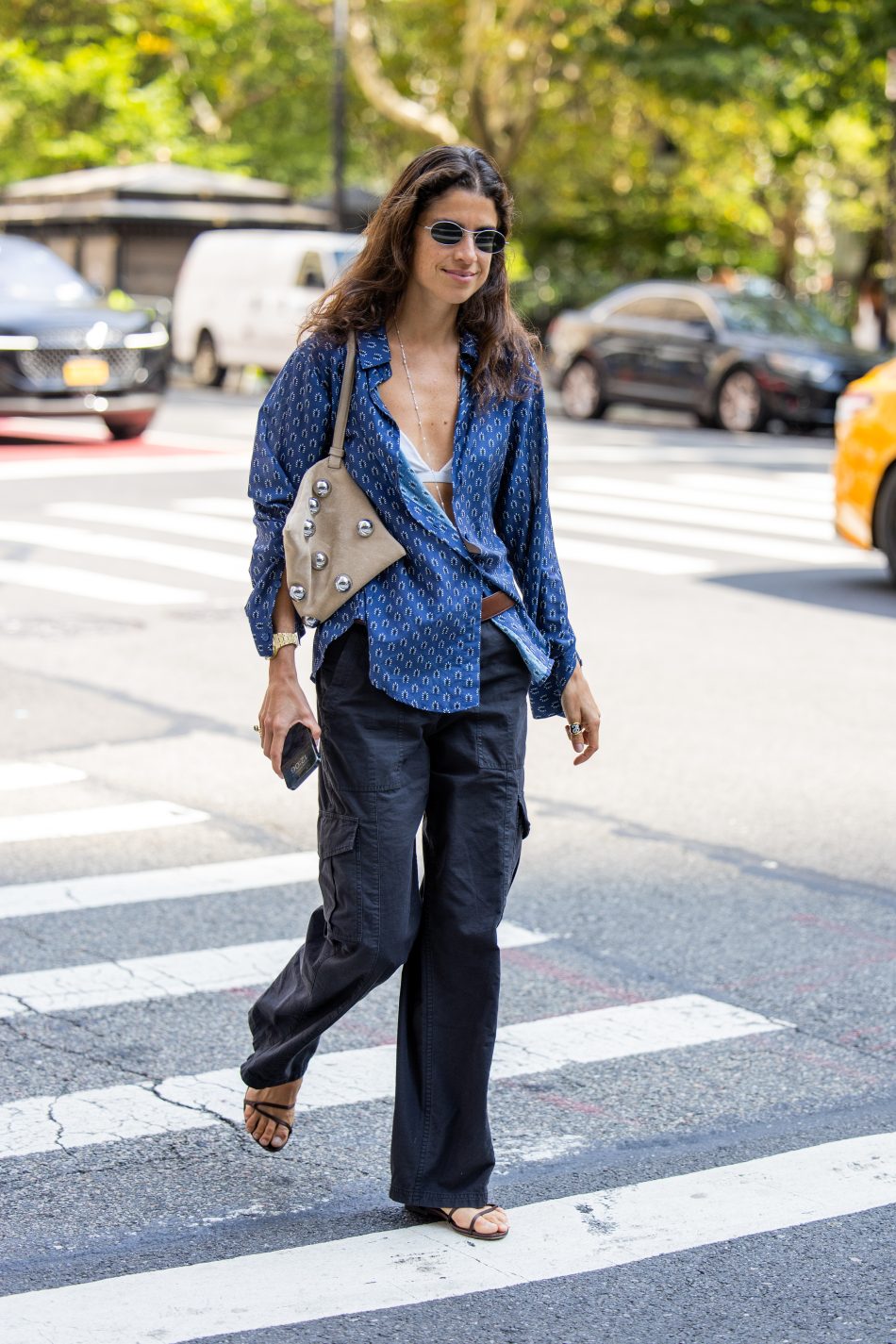 Leandra Medine Cohen har her stylet sine sorte cargo-bukser med et par elegante sandaler og en oversized skjorte for et komfortabel men fint sommer-look.