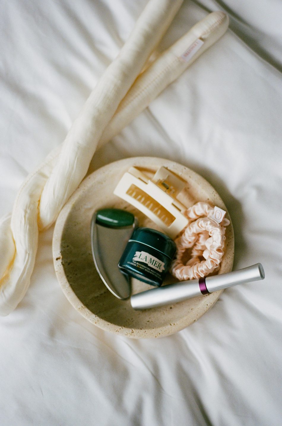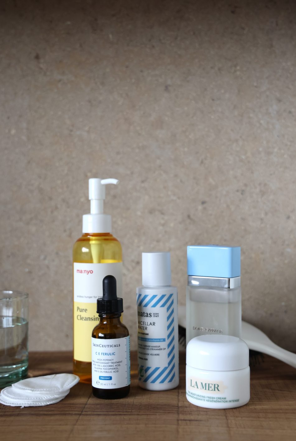 For mig gælder princippet “less is more”. Jeg kan bedst lide at holde min hudplejerutine enkel og bruge de samme få produkter både morgen og aften. Jeg starter altid med at påføre Ma:nyosrenseolie og bruger min gua sha fra La Mer i et par minutter for at få gang i blodcirkulationen og løsne spændinger. Derefter bruger jeg SkinCeuticals ’C E Ferulic Serum’ og en fugtgivende creme, gerne La Mers ’The Moisturizing Soft Creme’. Til sidst afslutter jeg altid med en SPF fra Beauty Of Joseon til ansigtet – uanset om solen skinner eller ej.