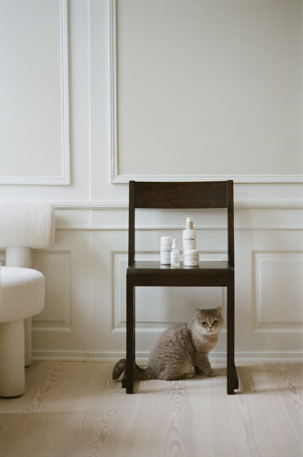 De daglige rense- og plejeprodukter fra Biologique Recherche med katten Luna.
